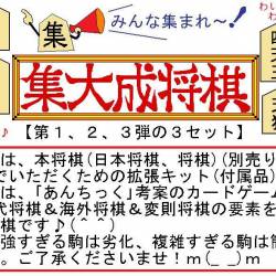 - 10年以上の歴史を持つ古今東西の駒で遊べる変則将棋です♪d(^^)販売累計300個超♪将棋は別売り!『集大成将棋』とは各駒がカードの駒に化ける感じの変則将棋です♪d(^^)手番を消費してカードを引き直すドローも可能ですが大会などではドロー禁止(ゲーム中のルール変更なし)で指してます♪(本記事の末尾にルール説明動画もあります♪)2019年にルール改良により洗練化されています♪・初期カード0枚→3枚でスタート!(最初から異次元で面白い!)・王手を受けている時はドローできない(長手詰めが可能!)このルール改良後は『集大成将棋2019』と呼ぶ事もあります♪(注)説明書のみの変更であり、上記2点しか変更点はありません!(注)現在販売中のものは全て『集大成将棋2019』です♪『集大成将棋』の魅力将棋好きな友人と旅行先で遊ぶのが一番盛り上がると思います♪d(^^)・旅館の将棋に合体すればOKなので、荷物が軽い!・棋力差があっても楽しめる!!・異次元将棋が楽しめて、良い思い出になる♪という感じです♪d(^ワ^)その他、YouTubeで「集大成将棋」と検索すると、大量に動画が見つかると思います♪魅力も理解しやすいかと思います♪\(^ワ^)体験版の通信対戦も可能だぞ~!(本記事末尾の大会動画の説明欄を参照♪)お得情報!【新型将棋セットR】(送料込み税込1200円♪)BOOTHにてセット販売をやっています♪\(^ワ^)/珠玉の将棋商品をまとめてゲットしよう!!