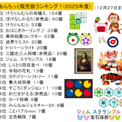 - 【あんちっく販売数ランキング】2025年度発表~!1位:けろりんむらの田植え:154個2位:ぼけなしかるた(非売品):60個3位:けろりんむら:53個たね企画室作品が上位独占!\(^0^)/久々に販売数も100個超に伸びて あんちっく復活の兆しか…!!?非売品のランクインが多かったのも今年の特徴です♪d(^^)続いて累計販売数なんですが…毎年同じような感じになるのですが、今年は上位で順位の変動が起きてます♪\(^^)(ちなみに去年の販売数ランキングはこちら!)特筆すべきは初年度でいきなり『けろりんむらの田植え』が12位にライクインしています♪d(^0^)なお、新作が多かった2024年度に比べると2025年度は上手く新作が増やせなかったんですよね…『けろりんむらの田植え』のみとも\(^^;)2026年度こそは新作をラッシュする予定なので超ご期待あれ!!\(^ワ^)/