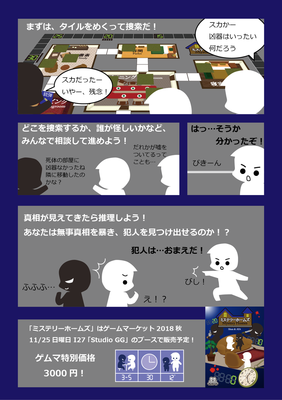 <2025秋 両 - B05 試遊○ <2023秋 土-ハ01 Studio GG @nannann2002 Studio GGはボードゲームデザイン担当のShunとディベロップ兼イラスト担当のAYAの二人で運営しているボードゲーム制作サークルです。 ・シンプルなルール ・ゲーマーにも楽しめる戦略性 ・ゆるいアートワーク を特徴とするボードゲームを制作しています。 新作「ミステリーホームズ」紹介漫画公開! 2018/10/31 20:30 ブログ 新作「ミステリーホームズ」紹介漫画公開! 当サークルStudio GGは、11/25(日)にゲームマーケット2018秋で新作『ミステリーホームズ』を販売予定です! ゲームの概要については、前回の記事で紹介していますので、そちらをご覧ください。 ゲームマーケット2018秋新作「ミステリーホームズ」の紹介 ゲームマーケット2018秋新作「ミステリーホームズ」の紹介2 今回は、「ミステリーホームズ」の紹介漫画を公開します。 協力型推理ゲーム『ミステリーホームズ』はゲームマーケット2018秋で販売予定です! 11月頭には予約受付等も行う予定ですので、よろしくお願いいたします。 最新情報はこちらから http://studiogg.doorblog.jp/ この記事をシェア