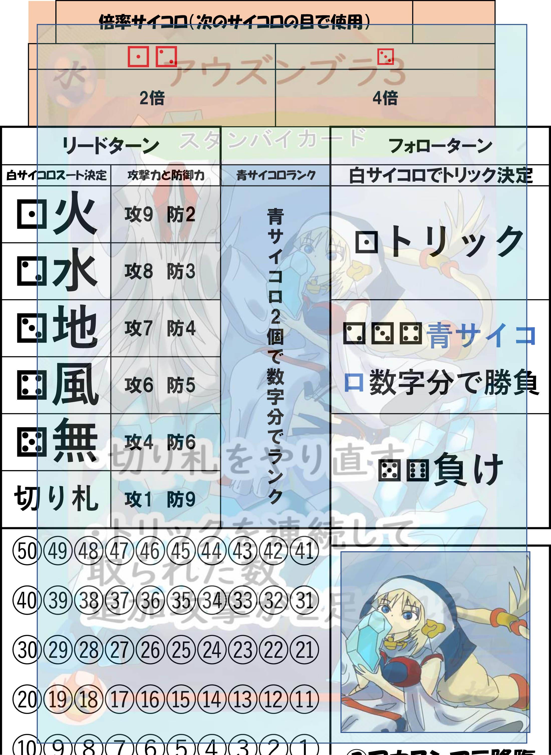 白サイコロはフォローターン時にトリックか負けか青サイコロの数字でトリテを勝負するかで、リードターン時に何の属性のリードをするかを決めます