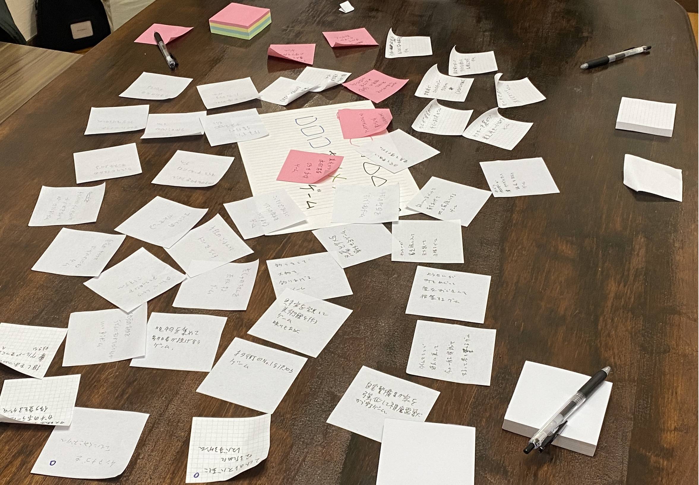 ゲームのアイデアを出し切ったあとに書き出しているのであまり出ないと思いきや、再度机を埋め尽くすくらいの付箋でいっぱいになりました。