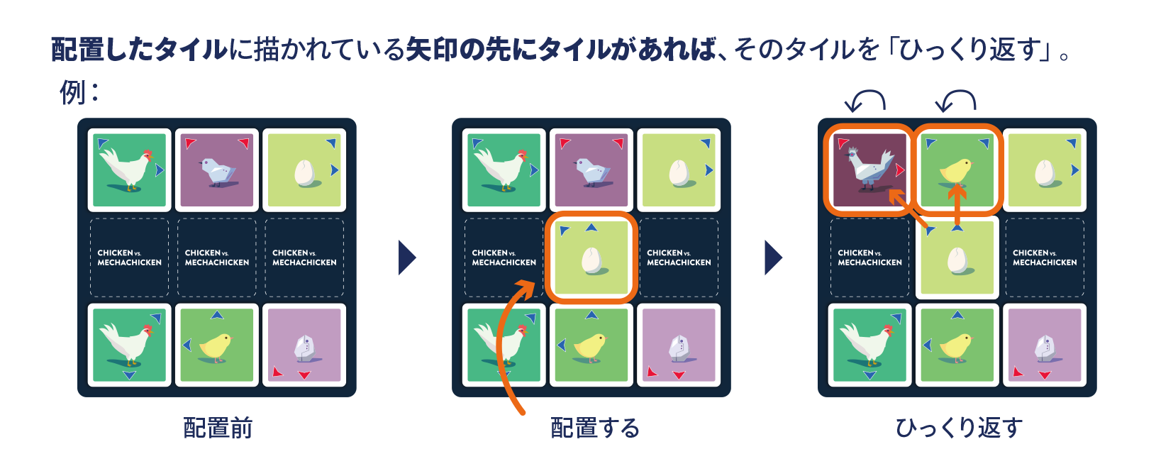 更に配置後にも、タイルに描いてある矢印の先にあるタイルをひっくり返したり。