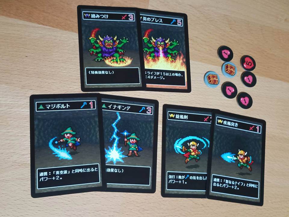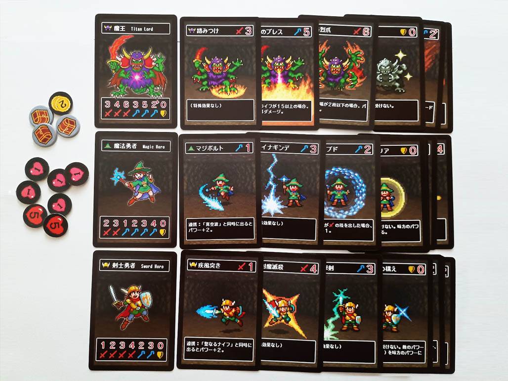 勇者2人のパワー合計と、魔王のパワーを比較し、大きかった側が相手のライフにダメージを与えます。 - 相手や味方がどのカードを出すかを推理してカードを出して行き、最後まで勝ち残るのが目的です!