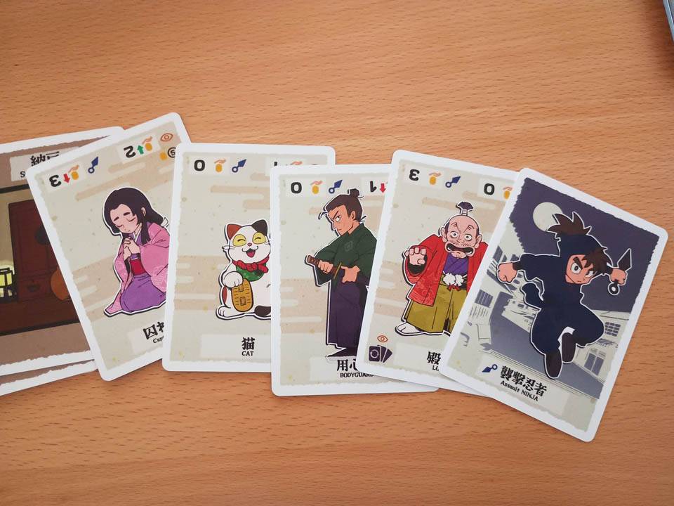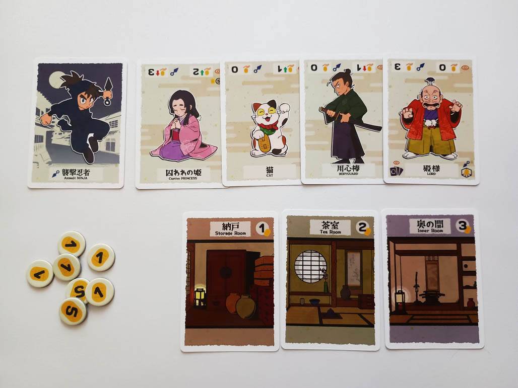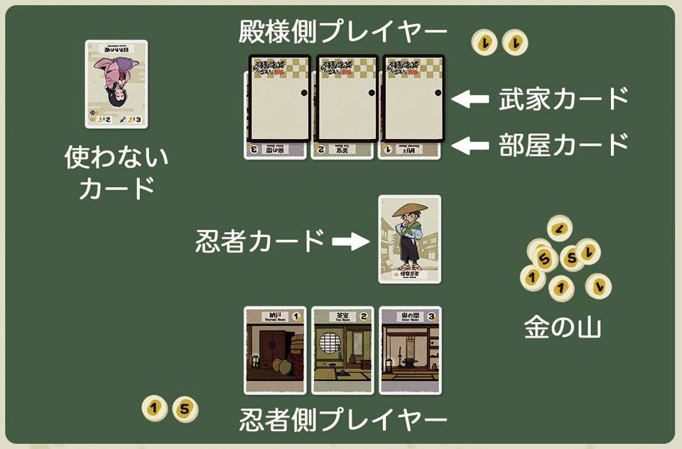 - 殿様側は忍者に悟られないように、3つの部屋に「武家カード」(殿様、用心棒、猫、囚われの姫のうち3枚)を配置し、「襲撃」から逃げのびて部屋の金の持ち逃げを目指します。