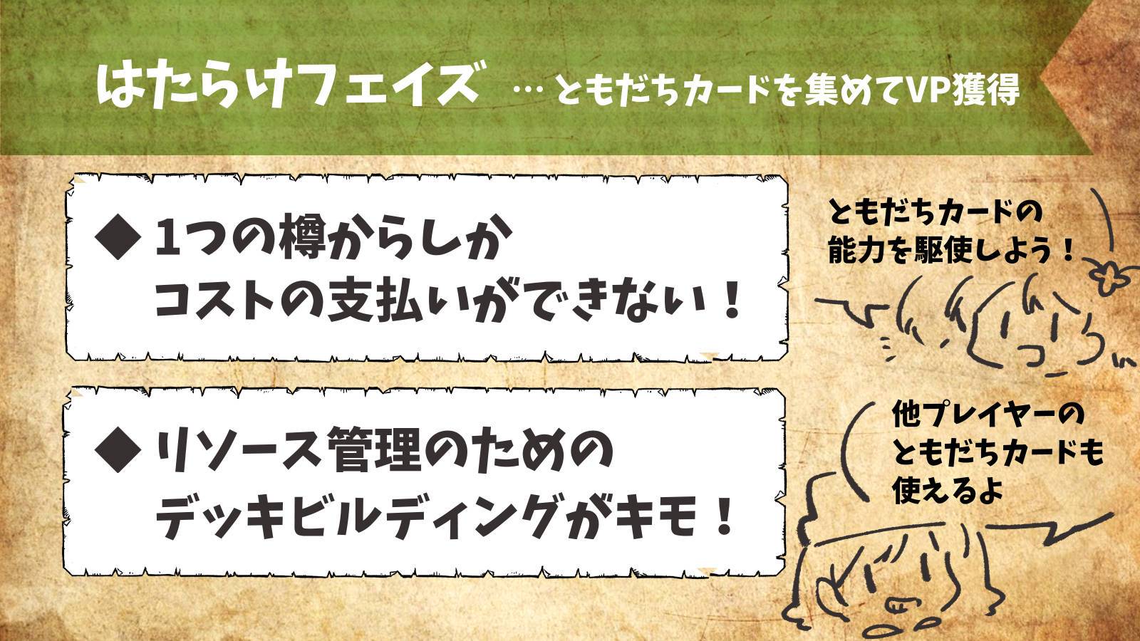 「はたらけフェイズ」では、ワインをコストとして支払うことで、「ともだちカード」を獲得したり、その能力を起動したりできます。