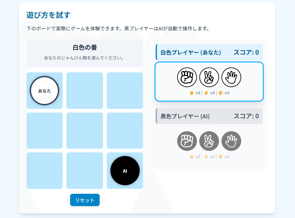 じゃんけん駒を配置 → プレイヤー駒が移動。これだけ。