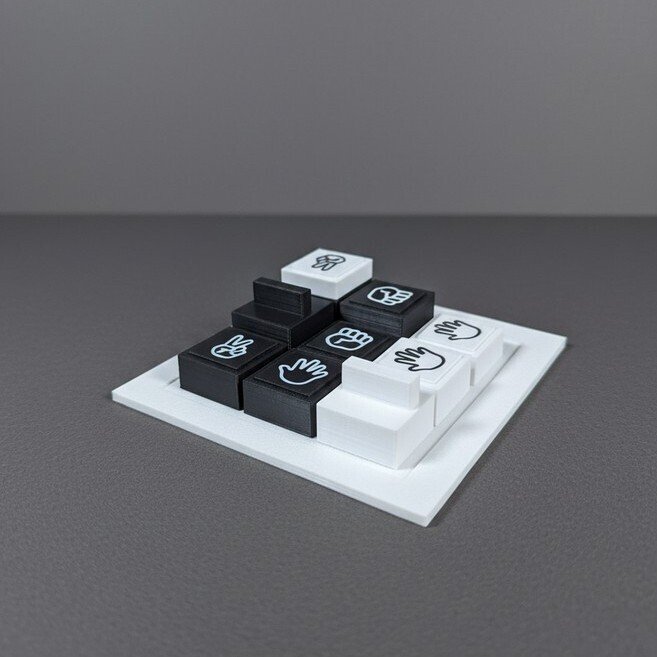 3×3のボード上でグー・チョキ・パーの駒を配置して、相手の駒に勝ちながら陣地を広げていく2人対戦ゲーム。