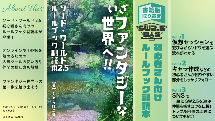 10/13に開催されたイベント「TRPGサミット」にて頒布した、ソード・ワールド2.5初心者さん、未経験者さん向けの同人誌『いざファンタジーな世界へ!!』を頒布します!