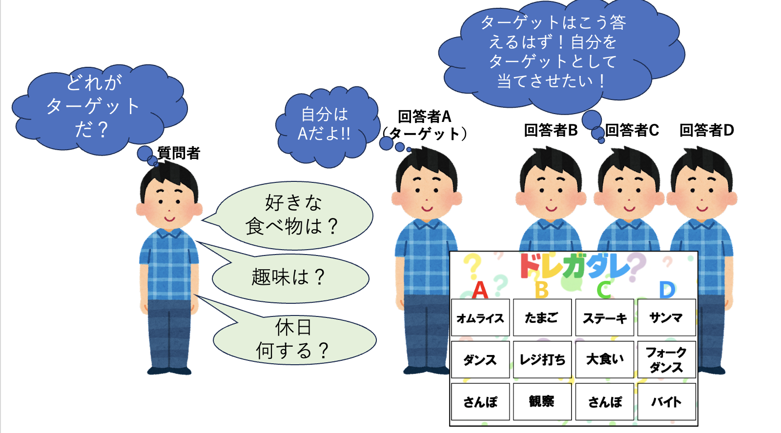 まず、事前にターゲットを決めておきます。質問者は最終的にどれがターゲットの回答かを当てることを目指すのですが、