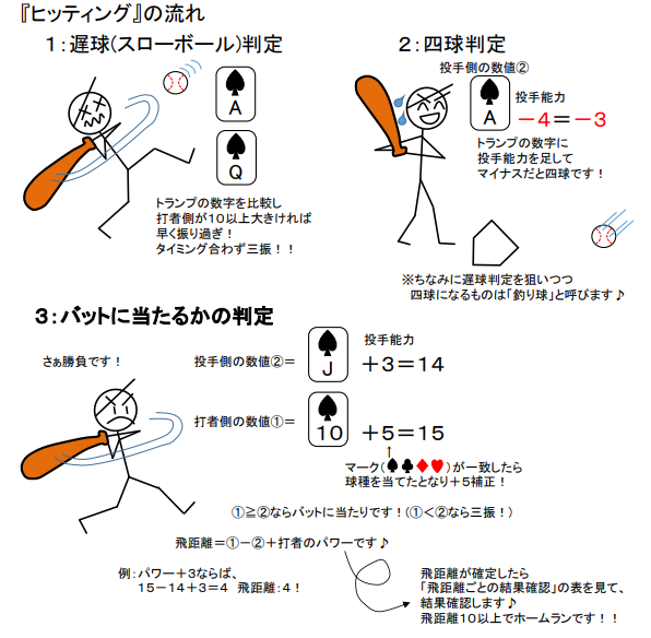 投手のトランプの数字+投手能力(マーク(♠♣♦♥)に対応した補正値)が
