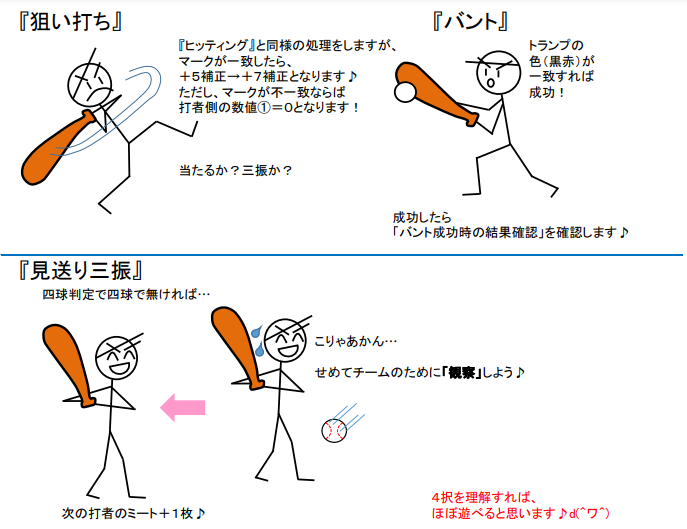 「バント」→マーク(♠♣♦♥)の色(黒赤)が一致すればバント成功!