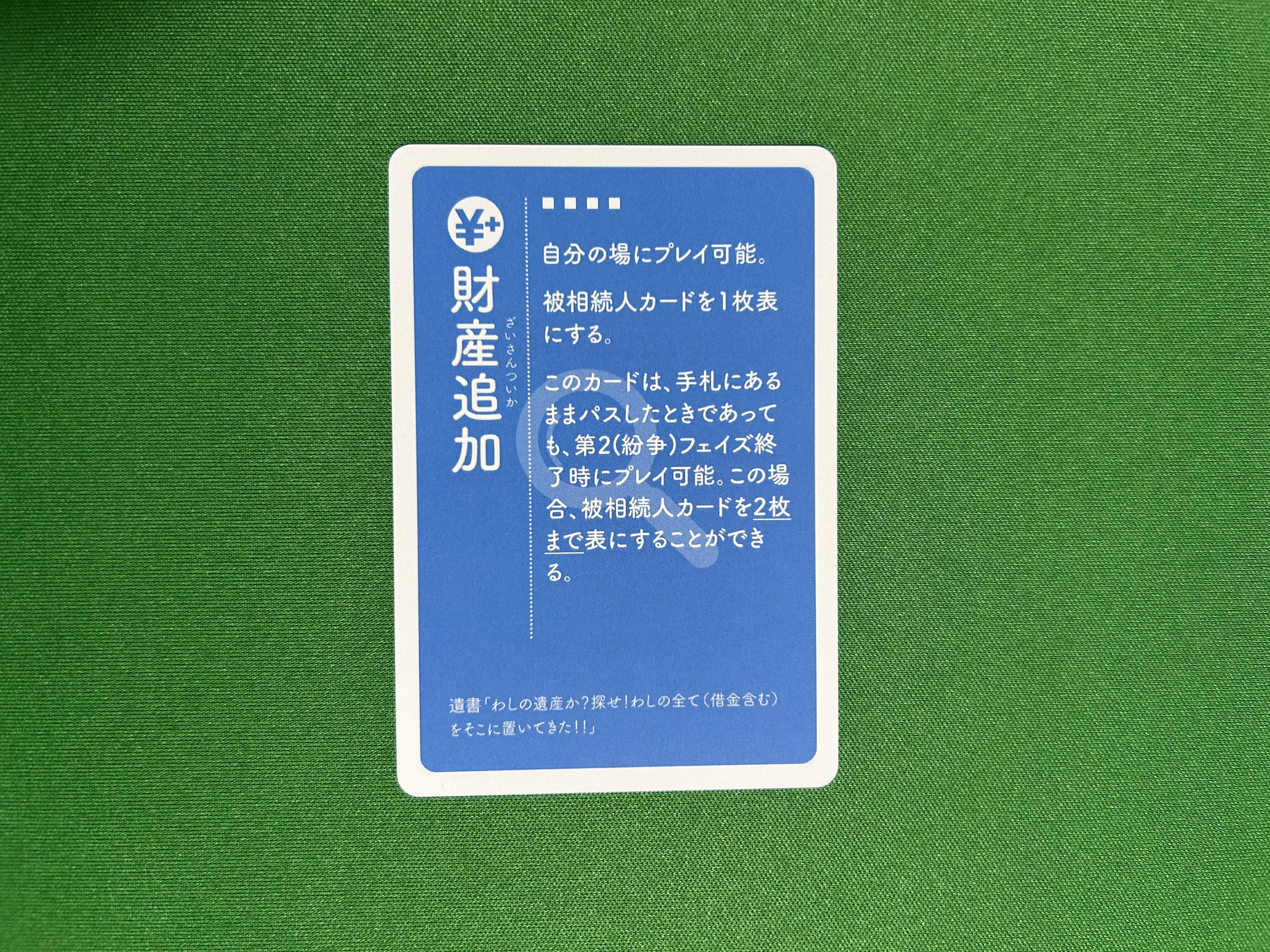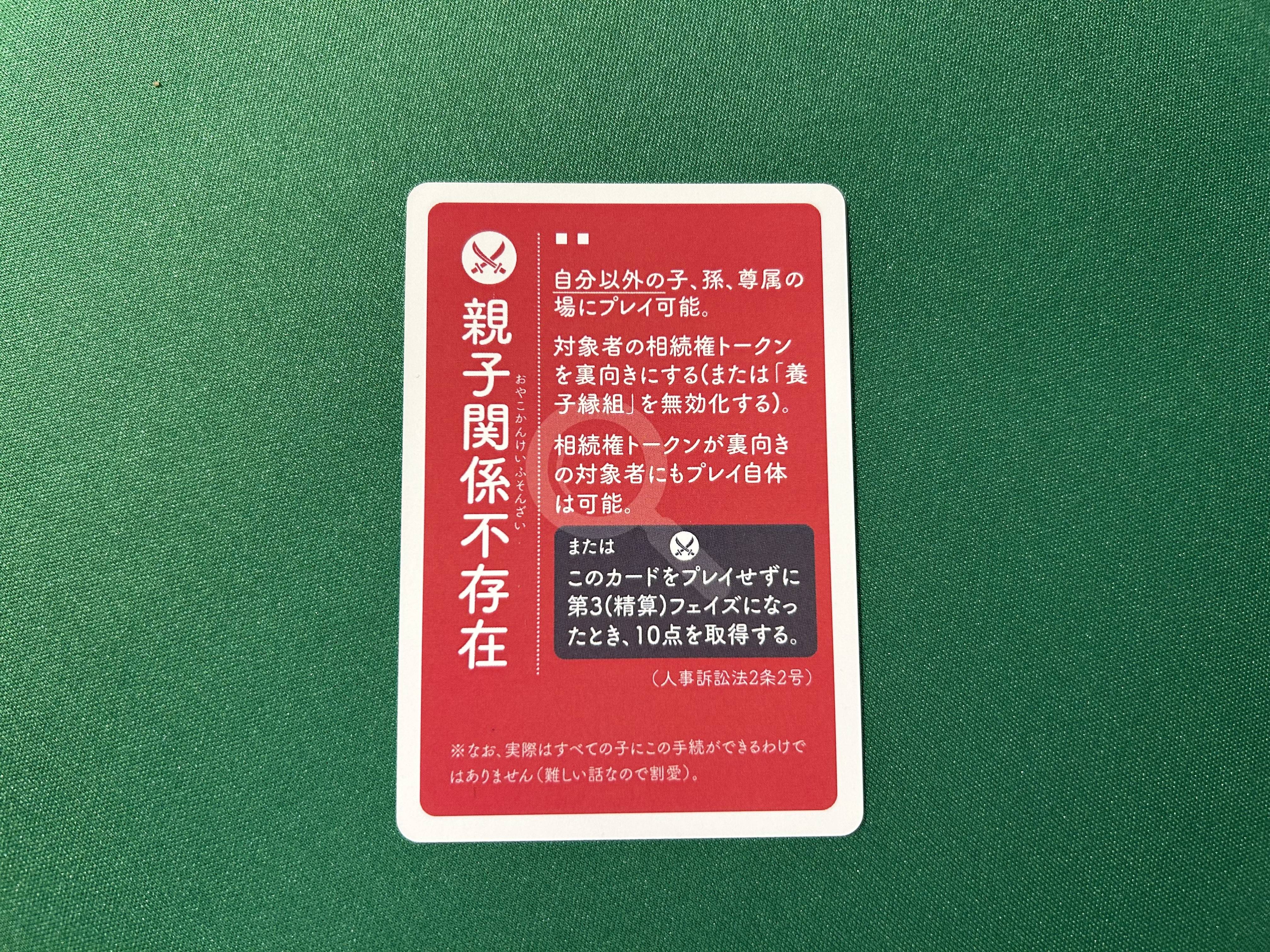 …とはいえ、このカードを使用して相続関係や財産関係がぐっちゃぐちゃになっていくのがこのフェイズの、ひいてはこのゲームの醍醐味なので、相続実務を絡めつつ、いくつかカードを紹介します!