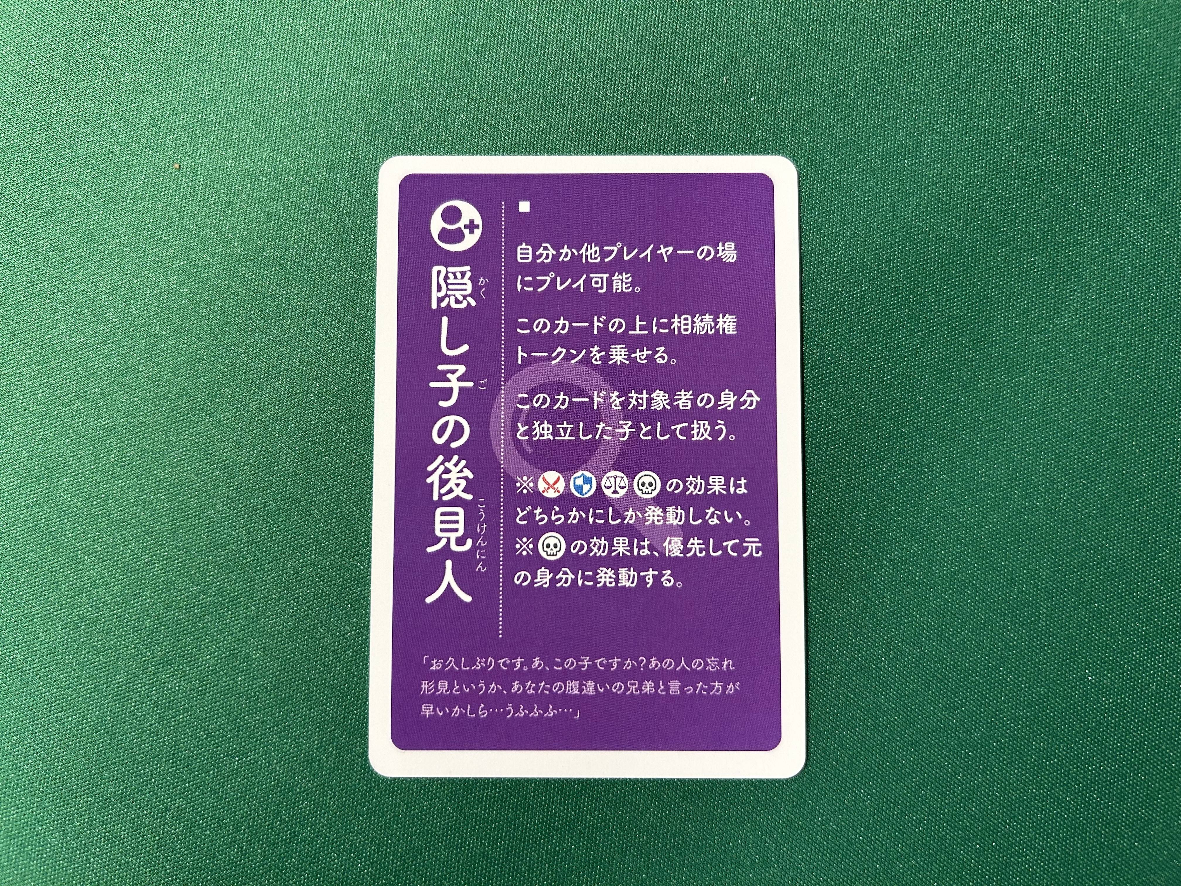 このカードは使用することができないため、基本的には手札に残り続けます。そして、表になるときはこのフェイズが終了した後になります。つまり、最後のフェイズになって初めて、自分には実は相続権がなかったという事実が、他のプレイヤーに発覚します。