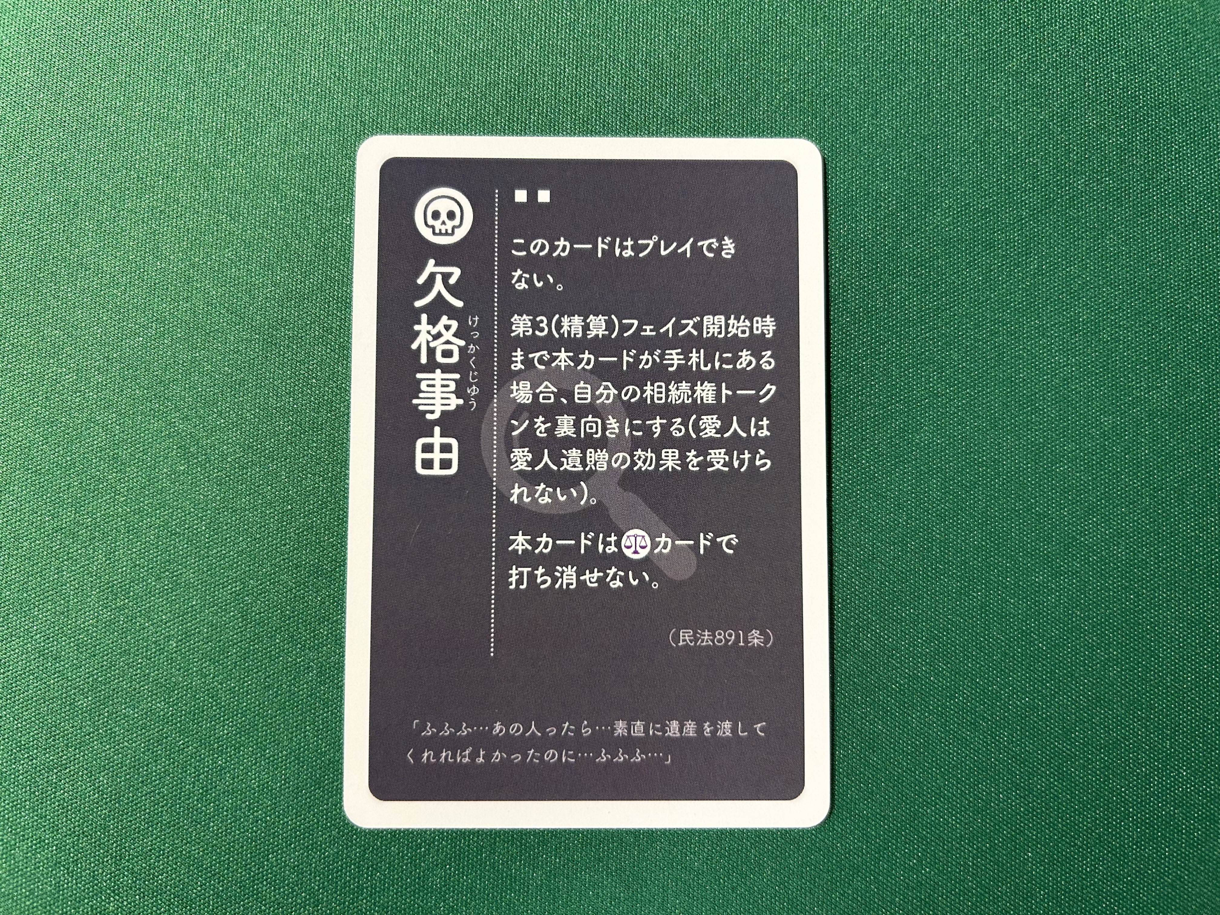 実務上、被相続人を殺してしまった人や、それを知りつつ黙っていた人などは、仮に相続する権利がある人でも、その権利が剥奪されます。なので、このカードを引いた人は、「そういう」人だったという意味です。