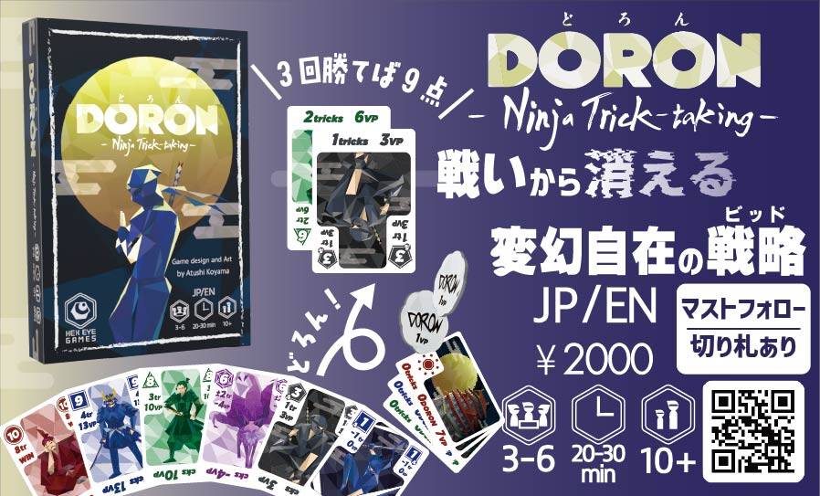 ゲームマーケット2025秋では、初作品『DORON -Ninja Trick Taking-』を出展します! 3~6人で遊べるトリックテイキングです。