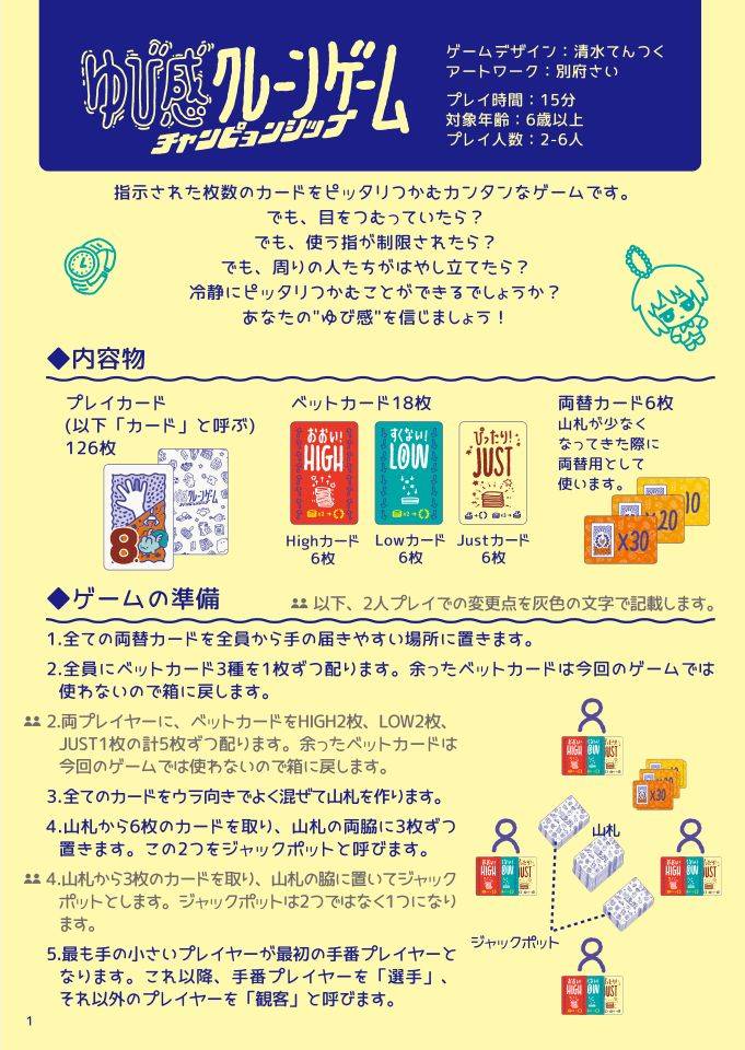 「ゆび感クレーンゲーム チャンピョンシップ」の説明書を公開します。観客の無責任な声援を受けつつ自身の"ゆび感"を試される緊張感が楽しいゲームです。カンタンなゲームではありますが、詳しくルールを知りたいという方はぜひご覧ください。