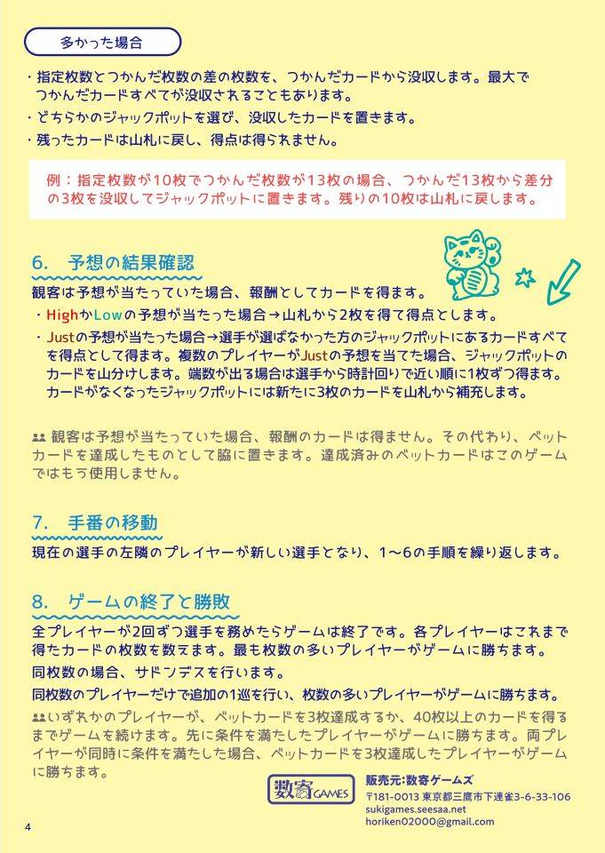 まあ、指示された枚数のカードをつかむだけというシンプル極まりないルールのゲームではありますが、ゲーム好きの方が読むと得点周りの作りにリスクとリターンが織り込まれていて「おやっ?」となる部分があるやもしれません。 「アイディアだけのゲームかと思ったけど、意外とこれ、奥が深いぞ?」と感じた方、ぜひ実際に試してみて頂ければと思います。