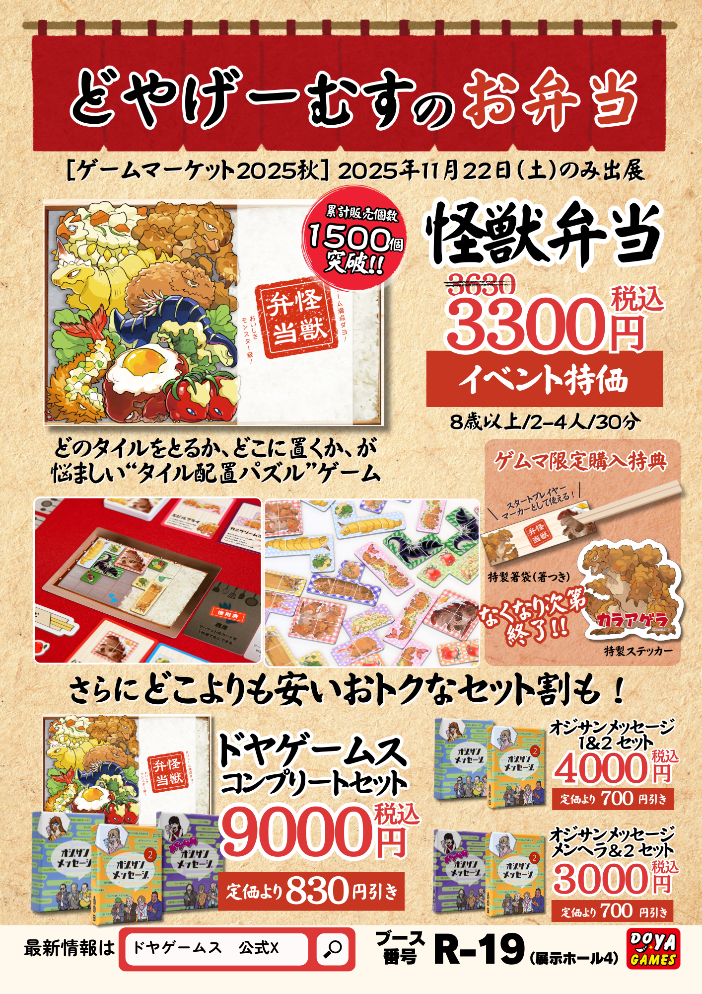 アクセスありがとうございます!ボードゲームの同人制作サークルの「ドヤゲームス」と申します。 2021年4月にボードゲームが好きな友人を集めて、「ドヤ」と誇れるゲームを、世界に。 という思いで立ち上げました。 2025年秋ゲームマーケットでのお品書きは下記です👇 『怪獣弁当』税込3300円(イベント特価) ゲームマーケット2024秋にて300個即完売! どのタイルをとる?どこに置く? が悩ましい タイル配置パズルゲーム 前回300個が3時間で品切れの人気作!今回再販売します。 プレイ人数:2-4人 プレイ時間:30分 対象年齢:8歳以上 詳細はこちら👇 https://gamemarket.jp/game/184002 さらに数量限定でどこよりも安い!イベント限定の特別割引セットを予定しております!ぜひお越しください。 ※なくなり次第終了です ・ドヤゲームスコンプリート セット ※オジサンメッセージ・メンヘラオジサンメッセージ・オジサンメッセージ2・怪獣弁当のセット 税込9000円(830円お得!) ・オジサンメッセージ 1 & 2 セット 税込4000円(700円お得!) ・オジサンメッセージ2 & メンヘラオジサンメッセージ 税込3000円(700円お得!)