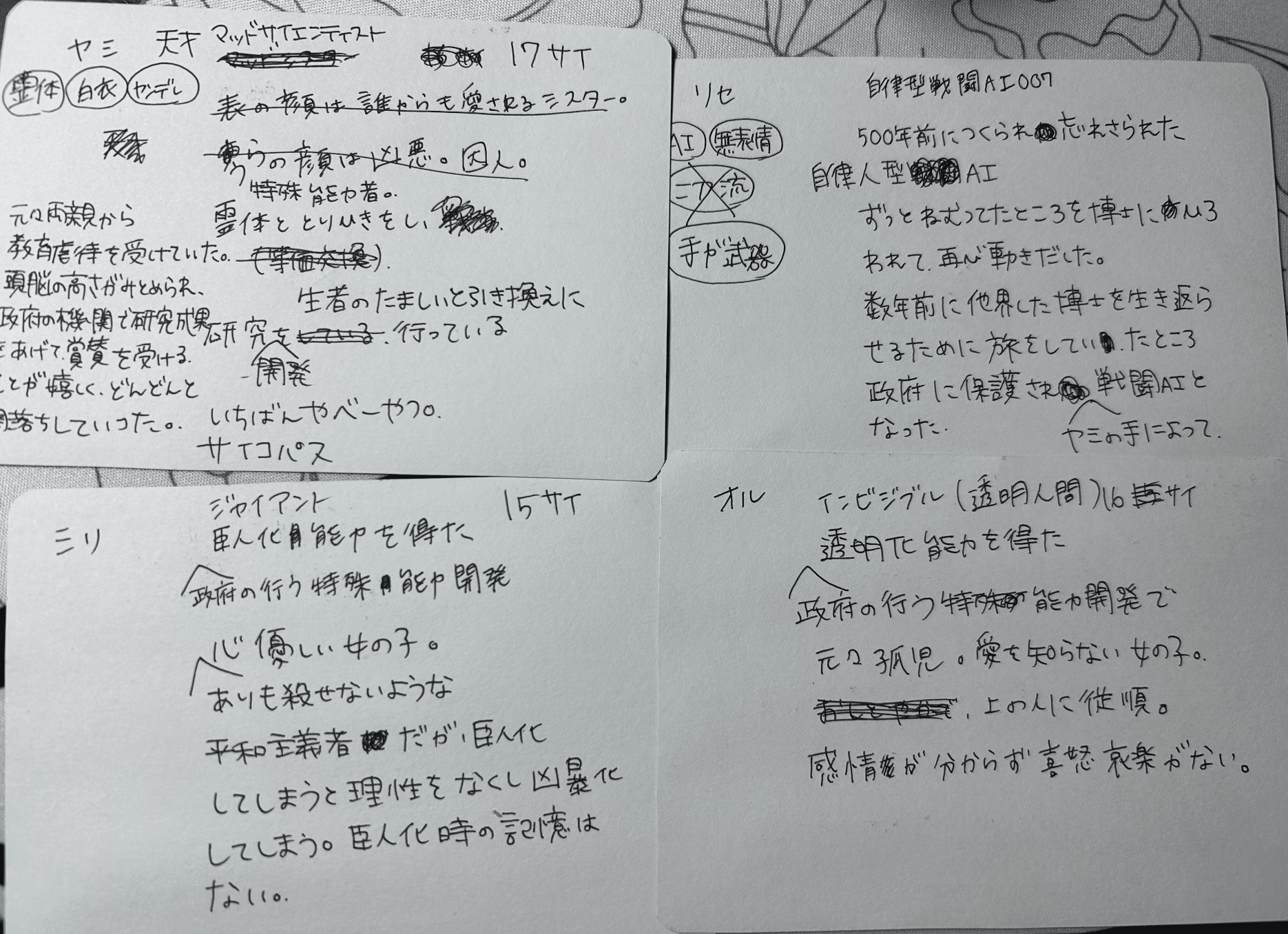 最初期のキャラ設定殴り書き。上二人は世界観と合わずにボツ。