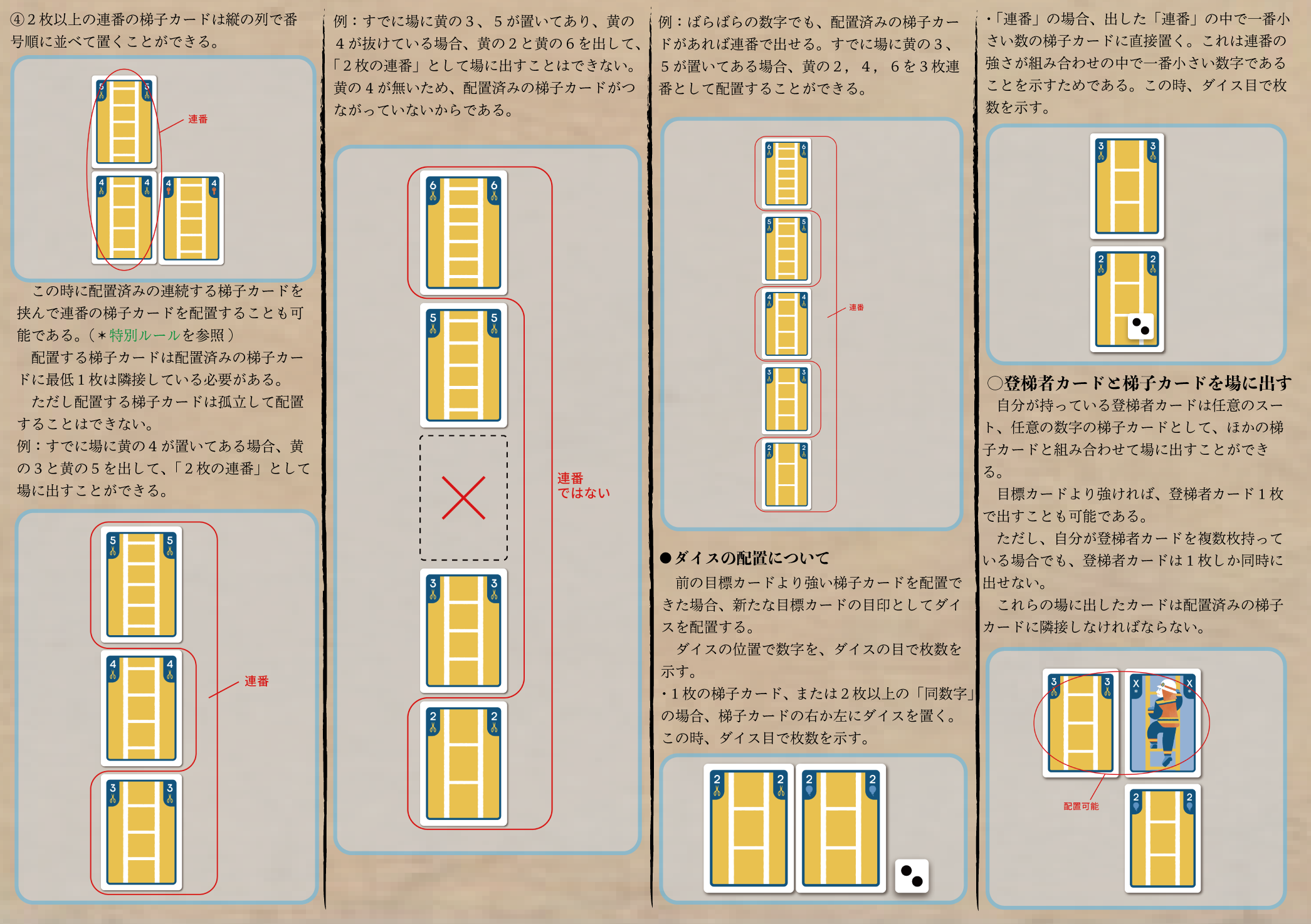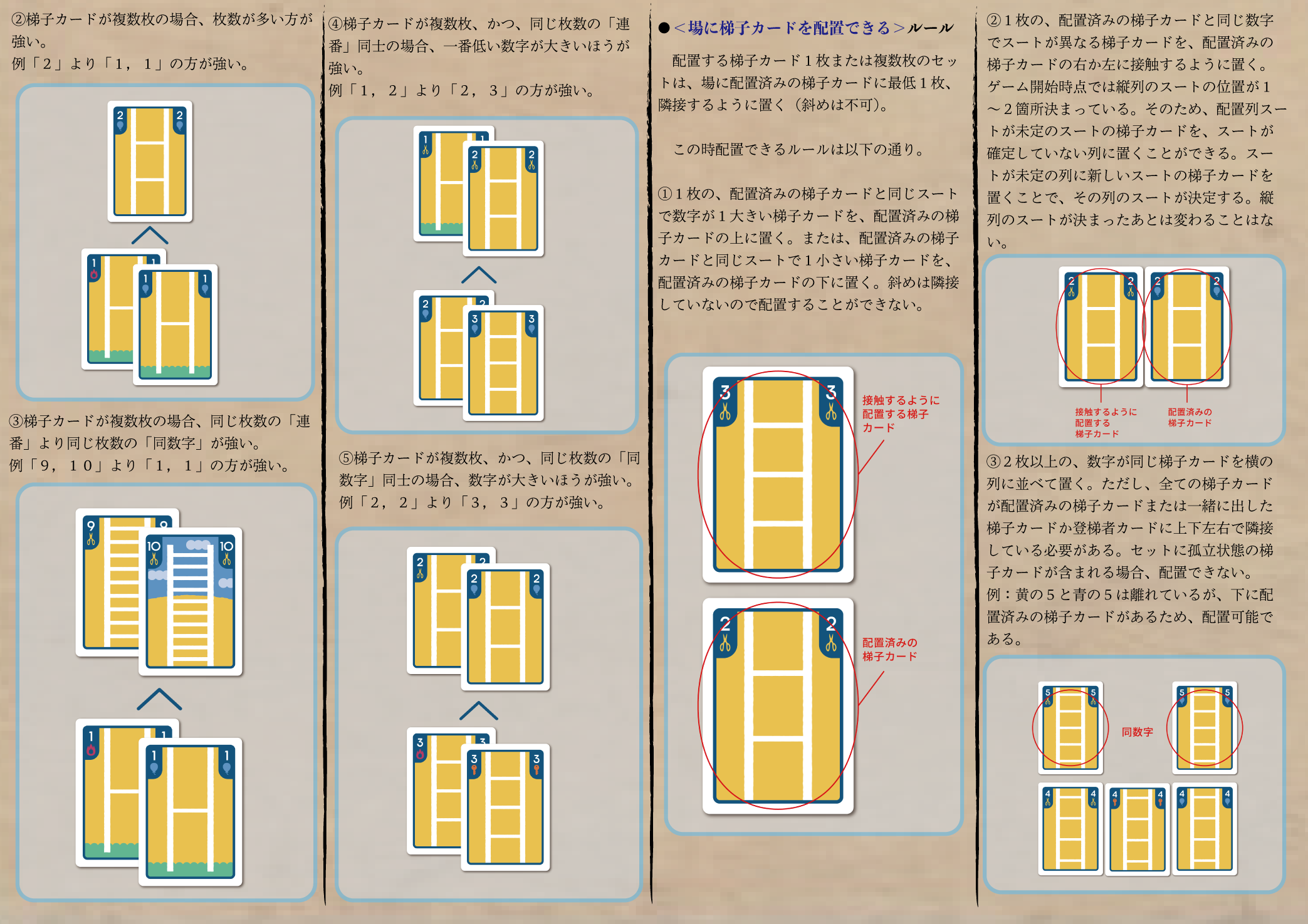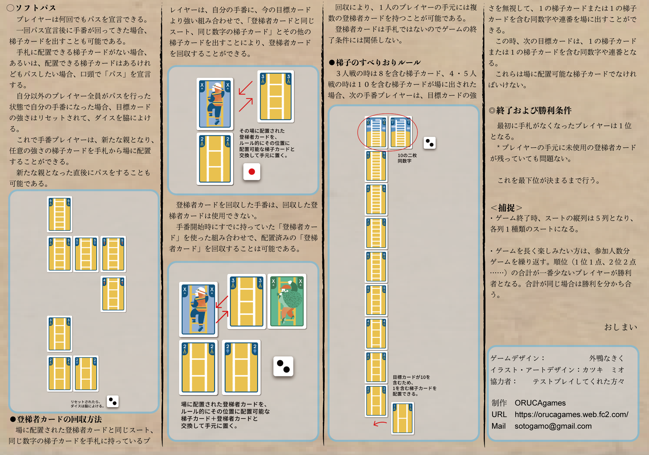 そんなに難しくないルールですが、カードの場への配置方法を、図を使って説明する必要があったため、ORUCAgaems初の日本語説明書2枚になりました。