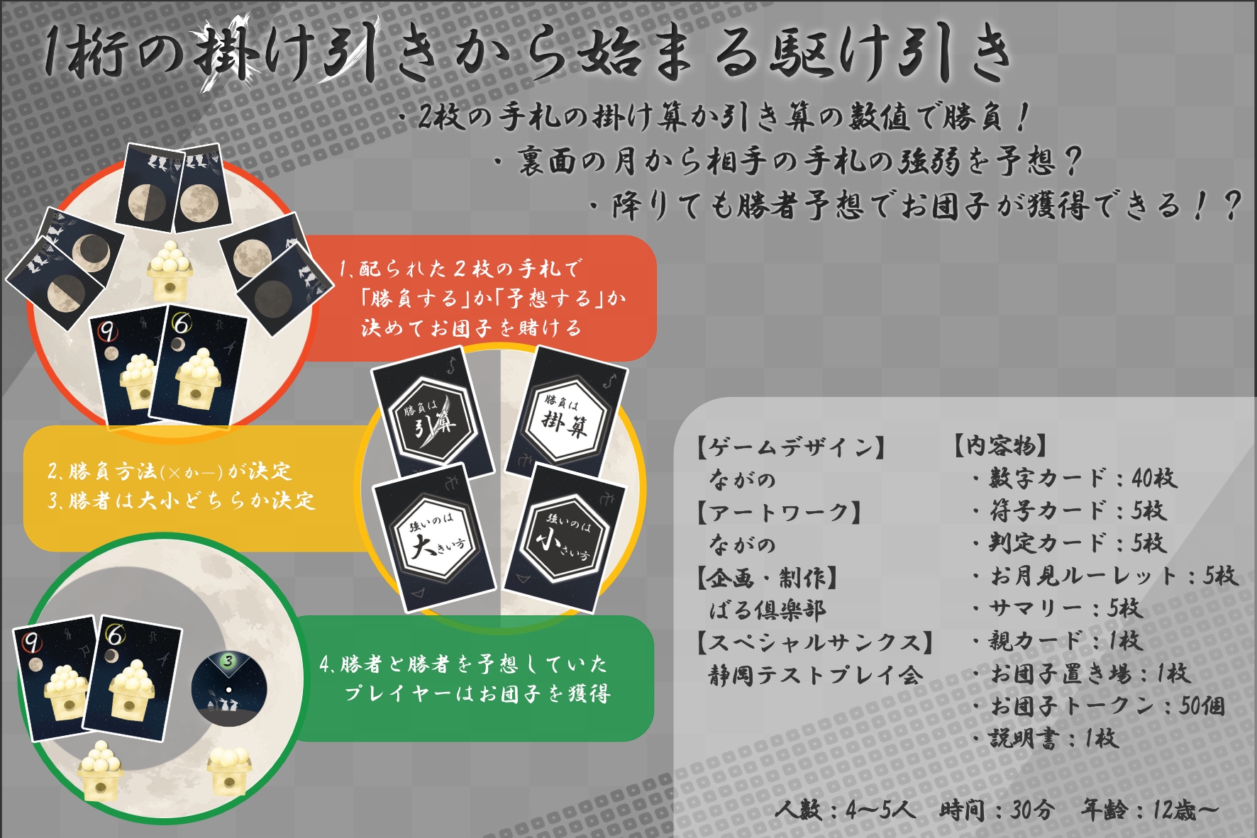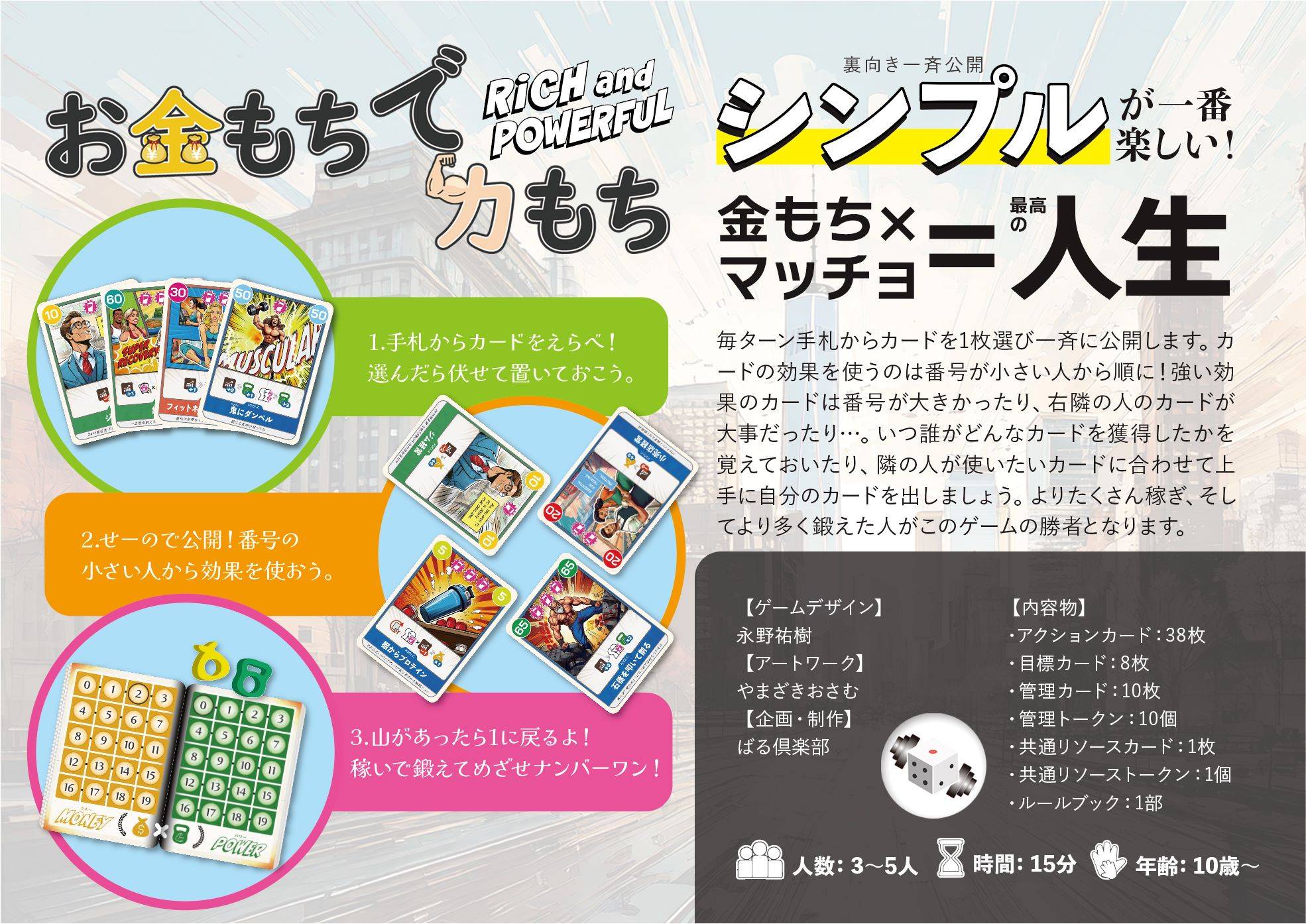 筋肉とボードゲームを愛する「ばる倶楽部」です! <ボードゲームは脳の筋トレ> ➡第1弾「筋肉の名~にくのな~」 大喜利系筋肉セットコレクション ➡第2弾「扶桑花札~ふそうはなふだ~」 スロットと花札を合わせた2人用対戦ボードゲーム ➡第3弾「コレクトリテ~ボディビルver~」 筋肉×セットコレクション×トリックテイキング ➡第4弾「動物回転盤~アニマルーレット~」 1つで2つの遊び方 正体隠匿&推理予測の得点勝負 ➡第5弾「お金もちで力もち」 リッチでマッスルな人物を目指す簡単ルールのバッティングゲーム ➡第6弾「掛け引きほーるでむ」 うさぎたちがお月見ポーカーでお団子の奪い合い
