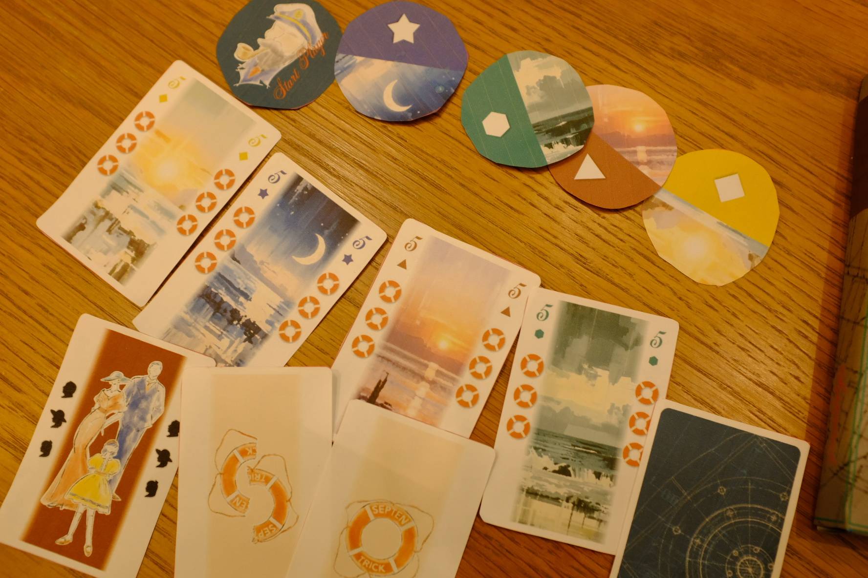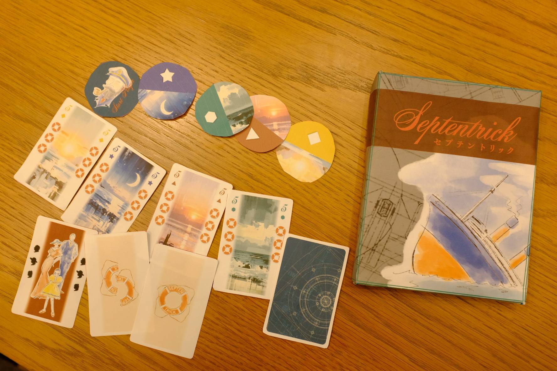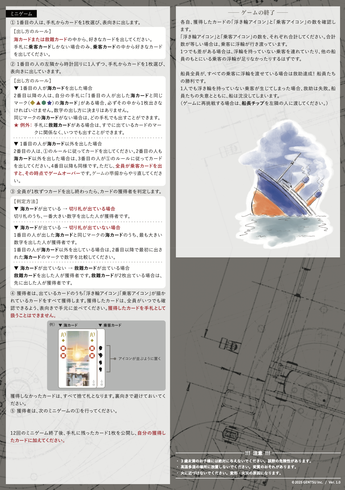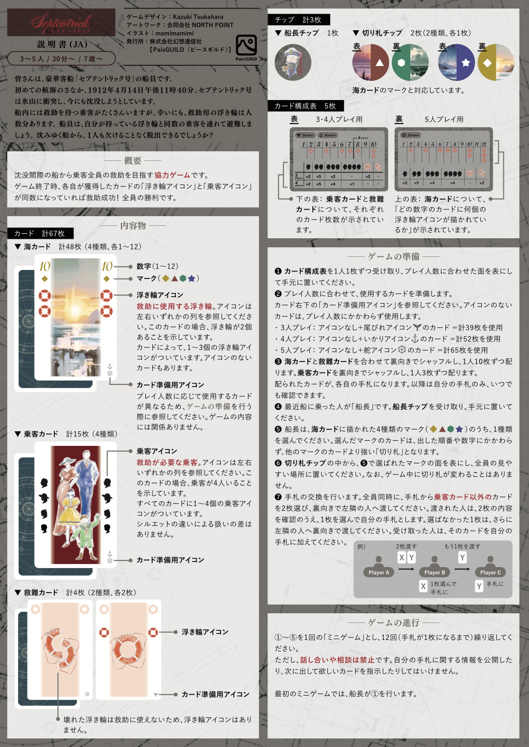 プレイヤーは船の乗組員となって協力型トリックテイキングゲームを進め、すべての乗客と浮き輪の数をぴったりそろえて全員脱出を成功させましょう。