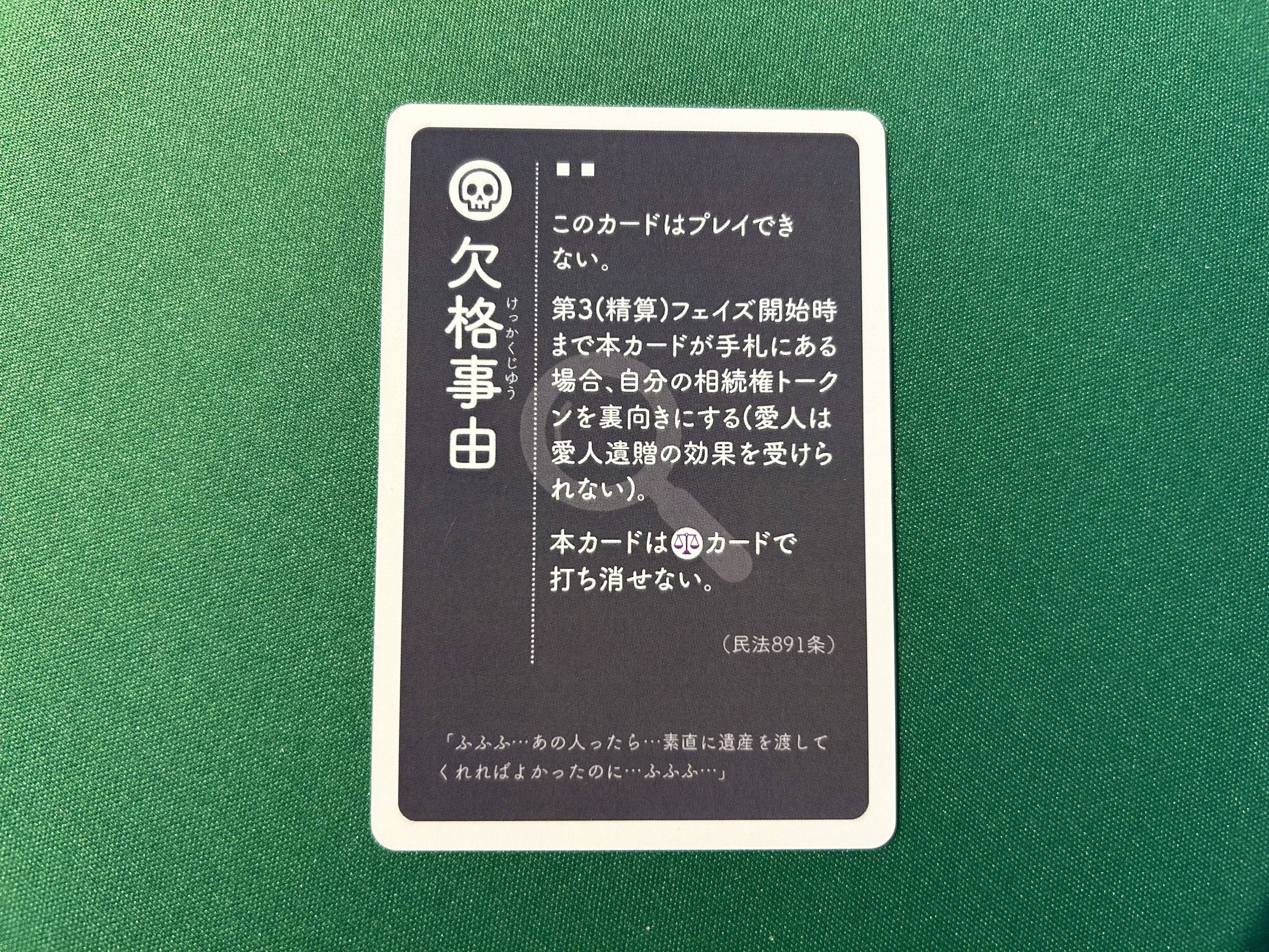 「欠格事由」はこのフェイズまで持っているプレイヤーが相続できなくなるババカードです。相続できなくなったプレイヤーが相続人だった場合、次の身分のプレイヤーに相続権が移ります。