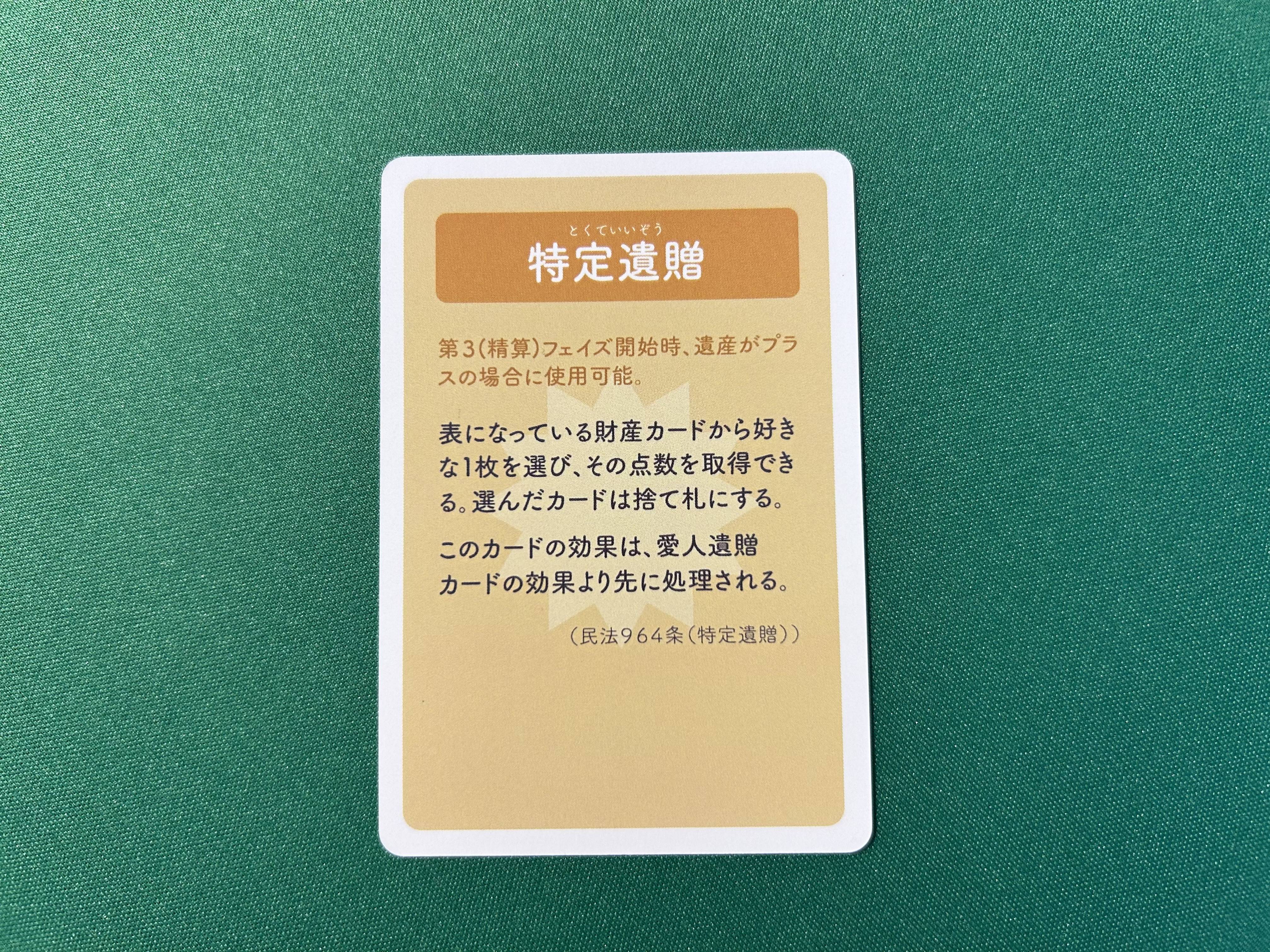 奥の手カードは、相続権がない身分のプレイヤーに対して配られるお助けカードです。そのうちの一つ「特定遺贈」は、任意の財産1枚を、他の相続人に先駆けて得ることができます。