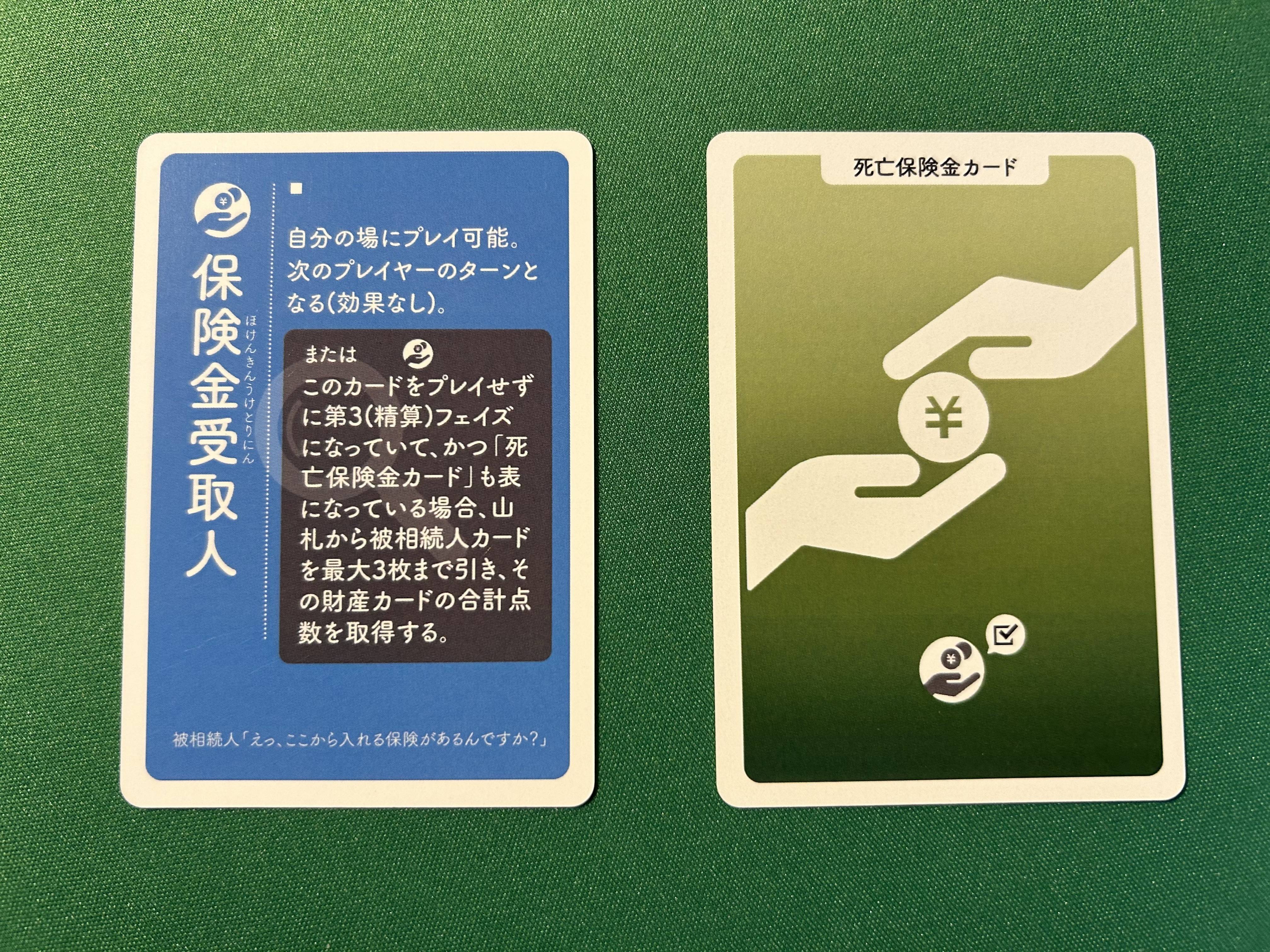このフェイズまでに「死亡保険金」が表になっているとき、「保険金受取人」を持っていたプレイヤーは、財産カードの山札から3枚引き、その合計を点数として取得できます。一気に大量得点のチャンスがある、めちゃくちゃ夢のあるカードです。