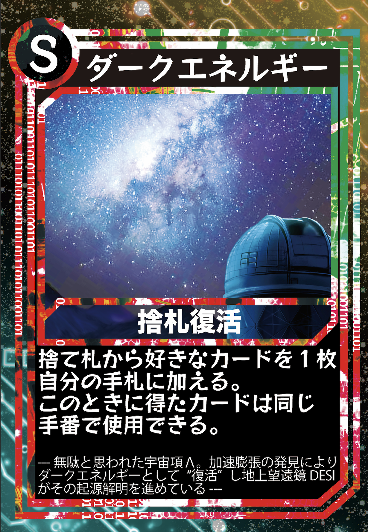ちなみに、カードイラスト、右下に望遠鏡が描かれているが、アメリカアリゾナ州にある地上望遠鏡 DESI (Dark Energy Spectroscopic Instrument)を描いたものである。この望遠鏡、ダークエネルギーの起源解明を大目標に建設された望遠鏡であり、2021年から観測が開始している。