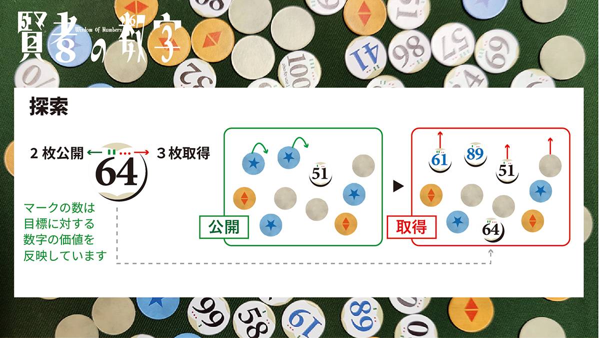 100枚の数字チップはウラ面が3種類あり、数字を推測できるようになっています。