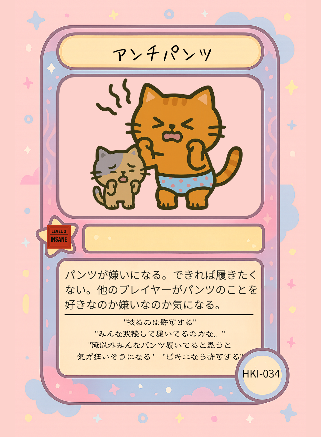 このカードを引いたプレイヤーはパンツが嫌いになり、自分がパンツをはいていること、他のプレイヤーがパンツをはいていること、それを知っていながら当たり前のようにコミュニケーションを取っていることに我慢できなくなります。完全に意味不明です。そのような考え方は存在していないので、パンツが嫌いな人というのはどのようにものを考え、感じているのか、どういった価値観で物を判断するのかを自身で想像する必要があります。