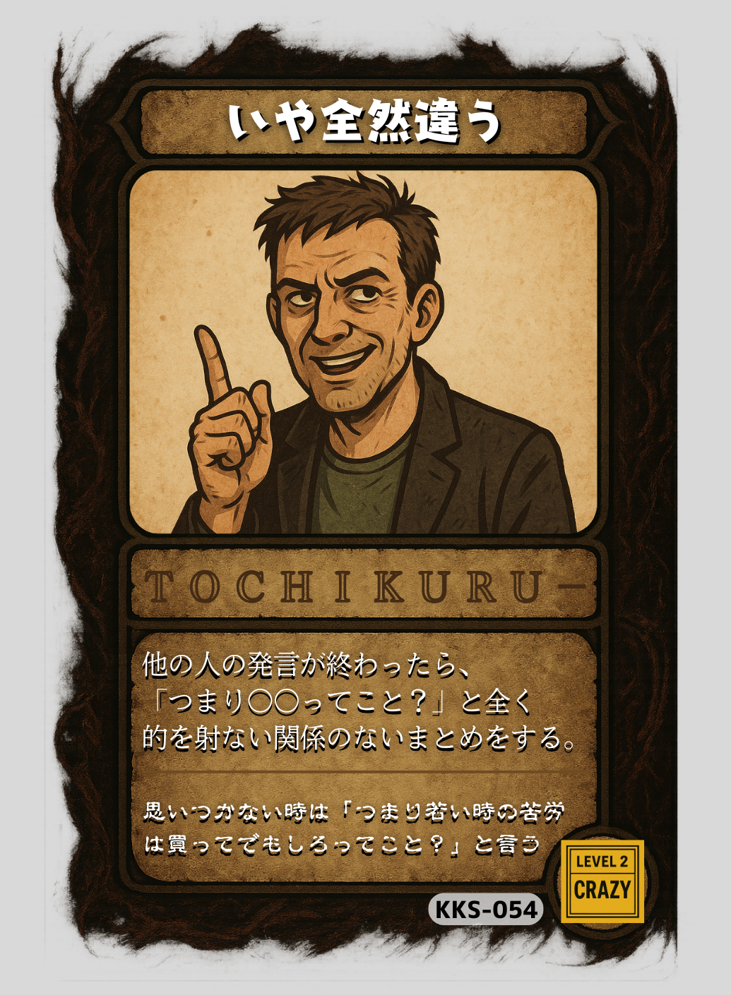 トチクルーには、カードに書かれているテキストを言い訳にして、普段自分の中に隠している狂気を合法的にみんなの前にさらけ出すことができるツールであるという一面もあります。それが色濃く反映されている一枚がこのカードです。