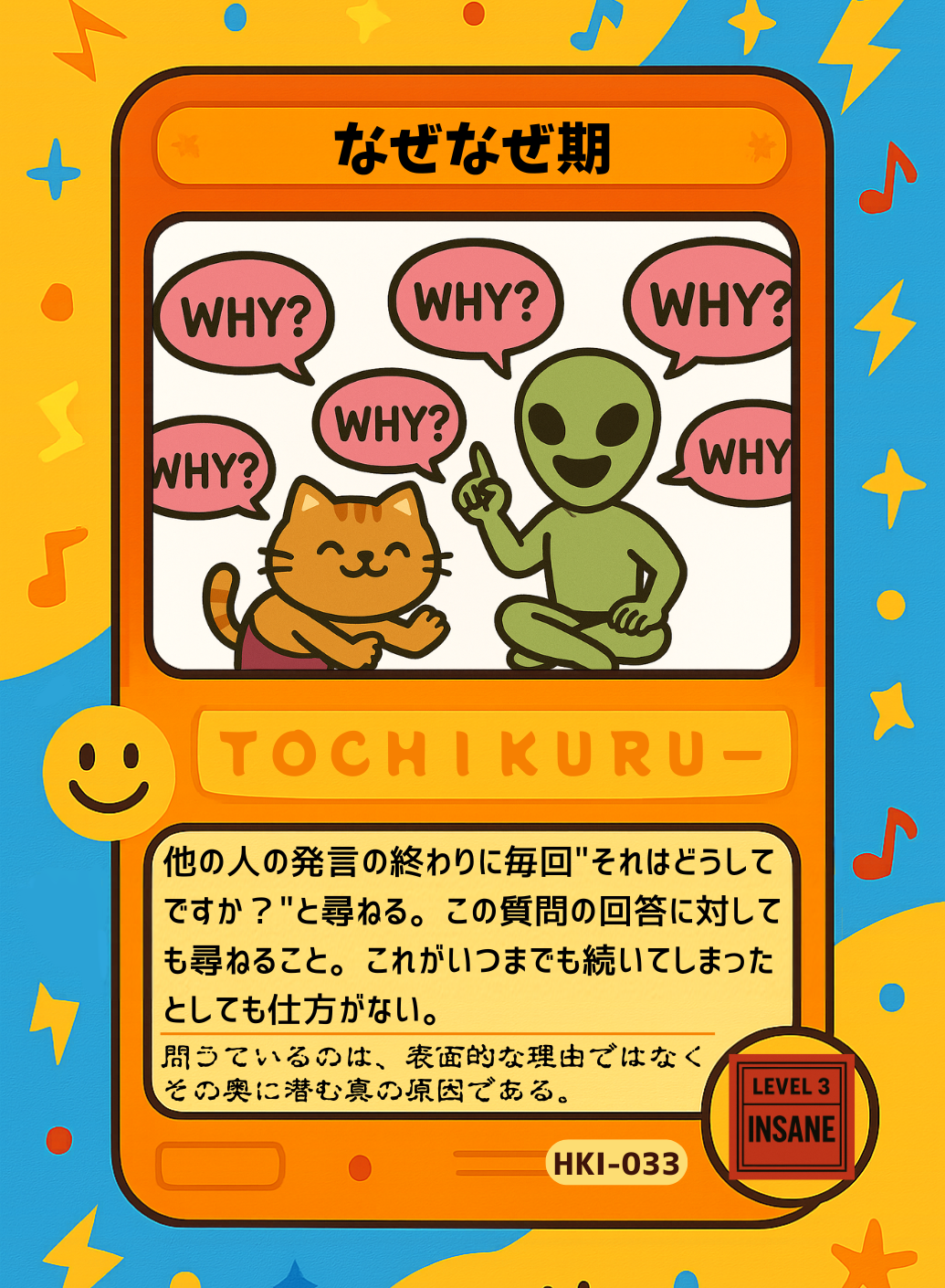 これも”5000万円プレイヤー” に匹敵するパワーカードですが、なんといってもこちらの強力な点は一切のコミュニケーションを封じることができるという点です。終わることなく質問を繰り返すため、情報を引き出したい相手の言葉の一切をシャットアウトすることが可能です。 現状の環境ではこれを打破できるカードは存在せず、開発者もテキストにまさかの"これがいつまでも続いてしまったとしても仕方がない"というメッセージを入れています。