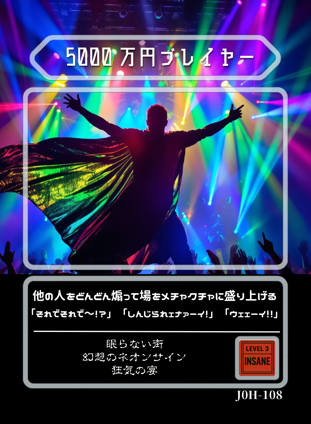 効果は単純にして明快で、とにかくうるさく騒ぎまくってよいというものです。これはガンガン攻めていきたい速攻型のプレイヤーや無尽蔵の体力を持つ持久型のプレイヤーにぴったりのカードで、コミュニケーションを終始自分のペースに持っていくことができます。話題や他のプレイヤーの狂気にかかわらず常に一定のパフォーマンスを発揮できるタイプの狂気で、もしこのカードを引いた場合は細かい計算をせずに攻めまくることをお勧めします。