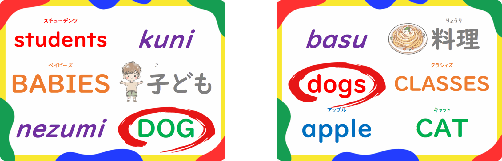 この2枚のカードの場合、「DOG(単数形・大文字)」と「dogs(複数形・小文字)」が共通の1語です。気づいた人が英語で宣言してカードを獲得します。山札がなくなるまで繰り返し、より多く集めた人の勝ち!