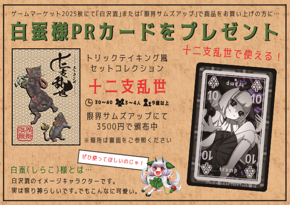 ゲームマーケット2025秋に向けてゲームを開発している同人サークルです! 「トリックテイキング風セットコレクション」の十二支乱世-エトランゼ-を開発中です!