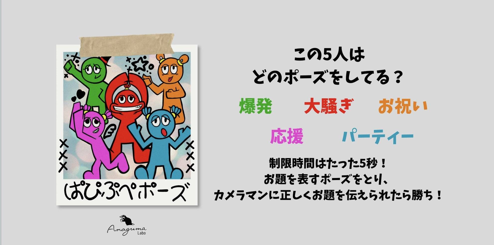 5つの似たお題から1つをポーズで表現し、写真を撮って当ててもらうゲームです。
