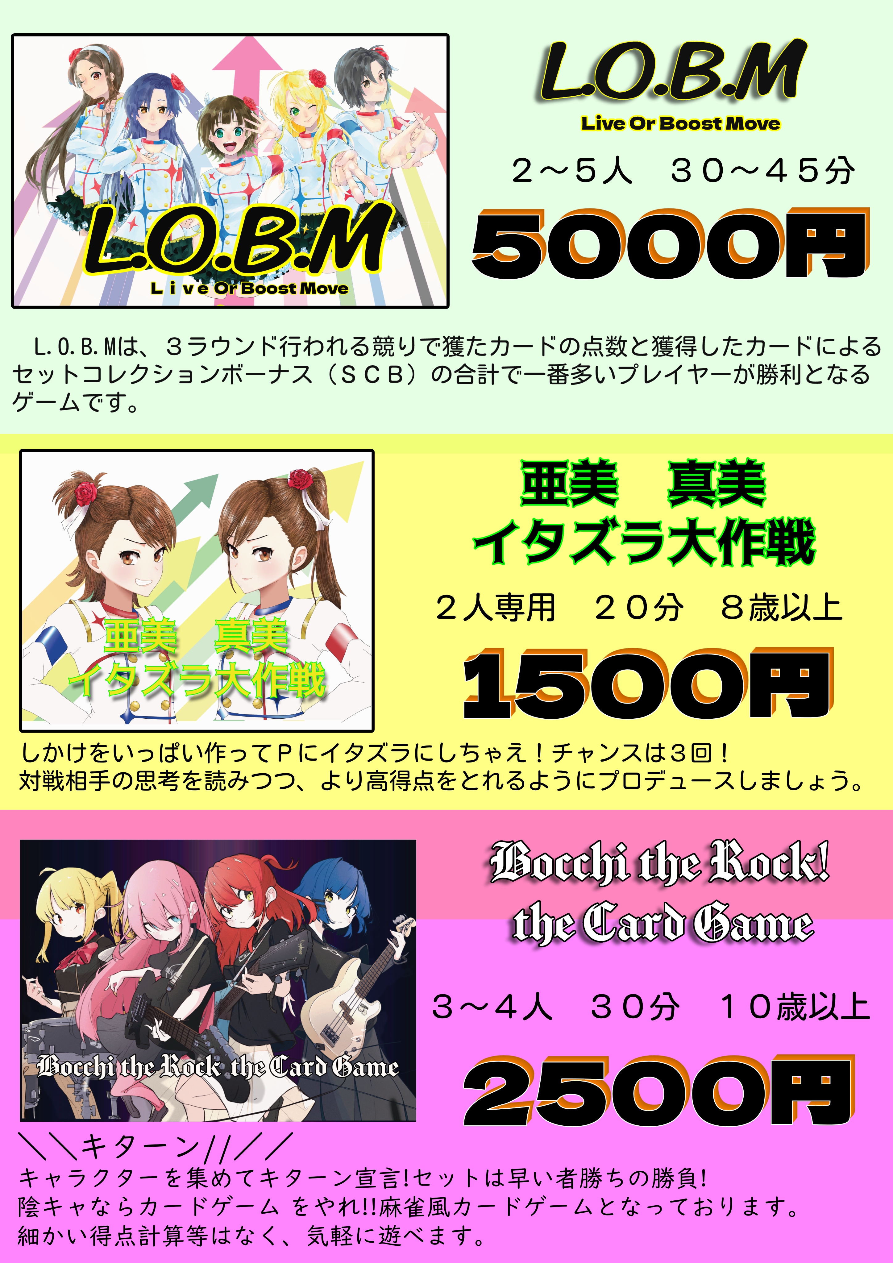 アイドルマスター やアニメの二次創作ボードゲーム作成サークルです。