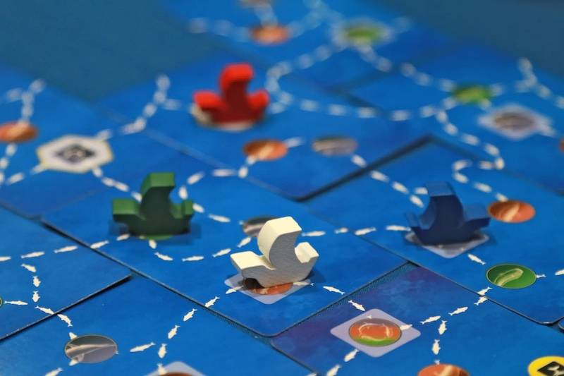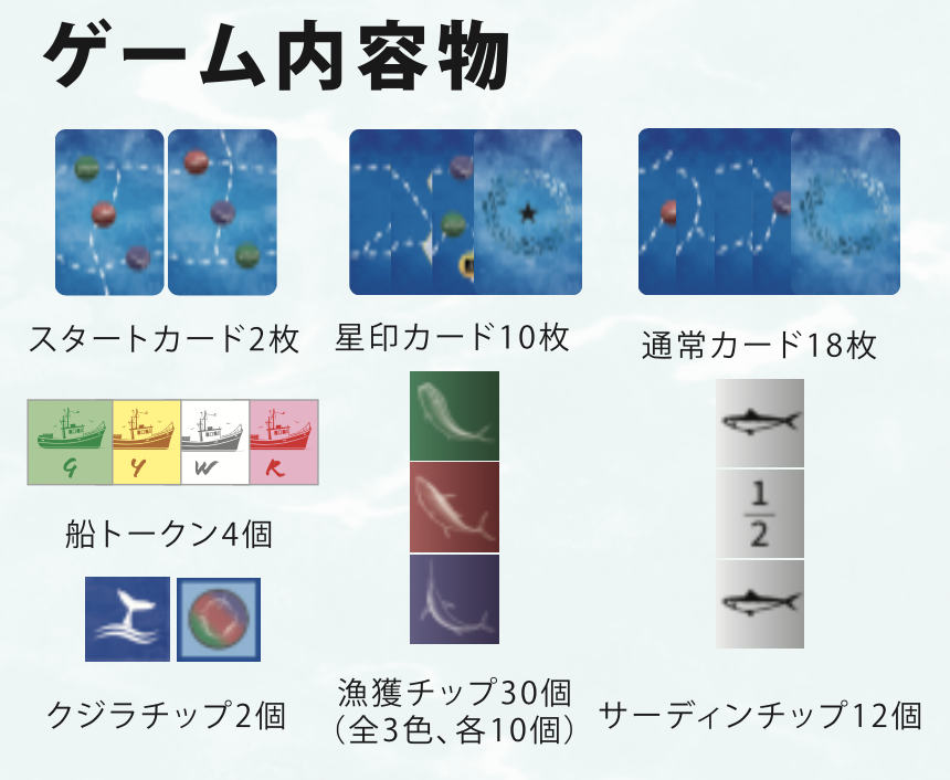 カードで魚群のルートを広げ、漁場に入り、カジキやマグロを獲って航路を描いて得点しよう。