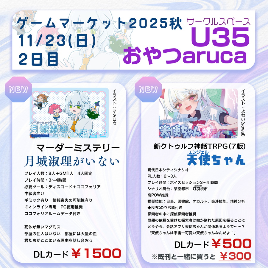 新作はマーダーミステリー「月城淑理がいない」と新クトゥルフ神話TRPG「天使ちゃん」になります