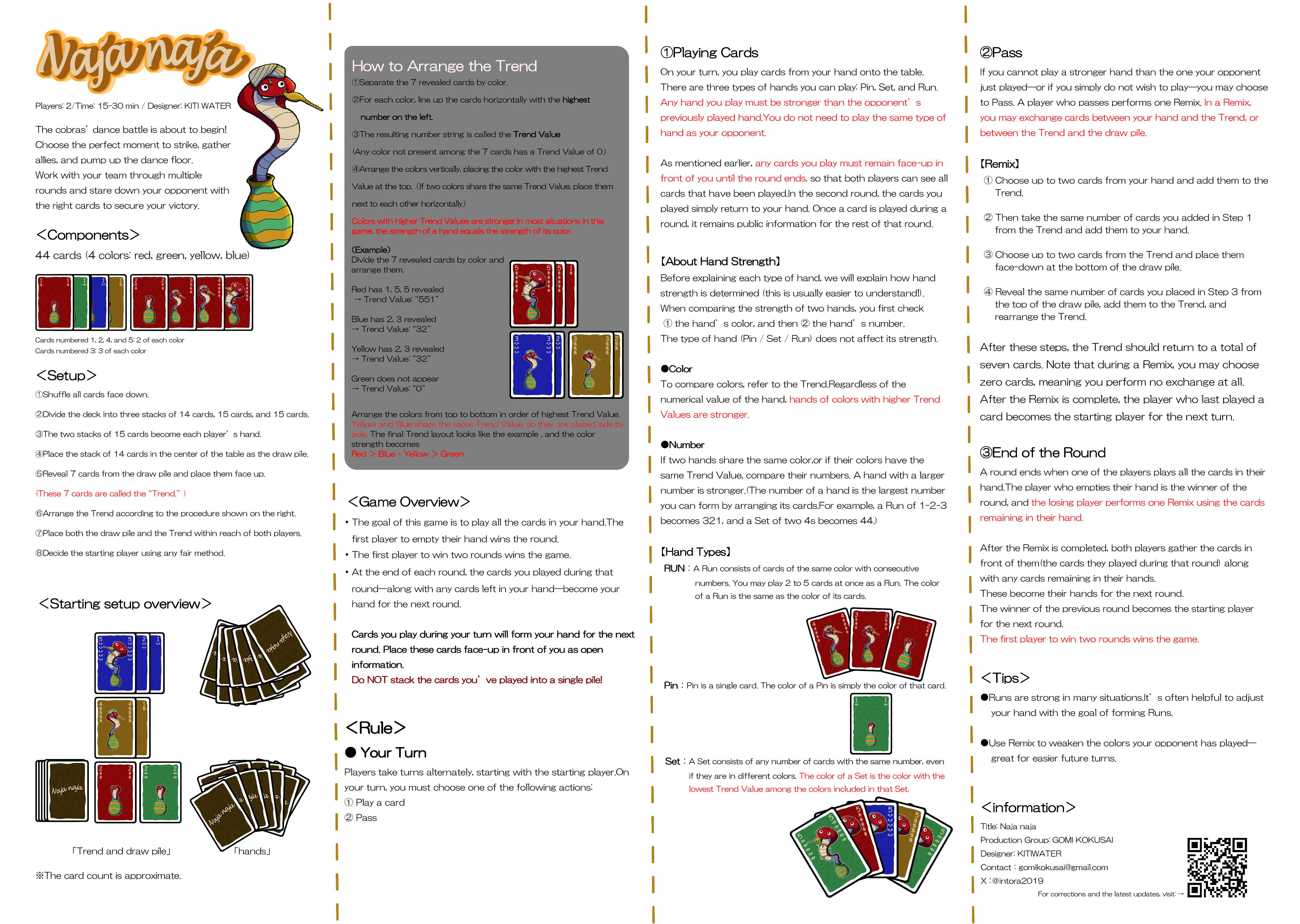 We’ve just released the English rulebooks for our two new titles: the quirky trick-taking game Storm in a Teacup and the two-player climbing game Naja naja. Please take a look!