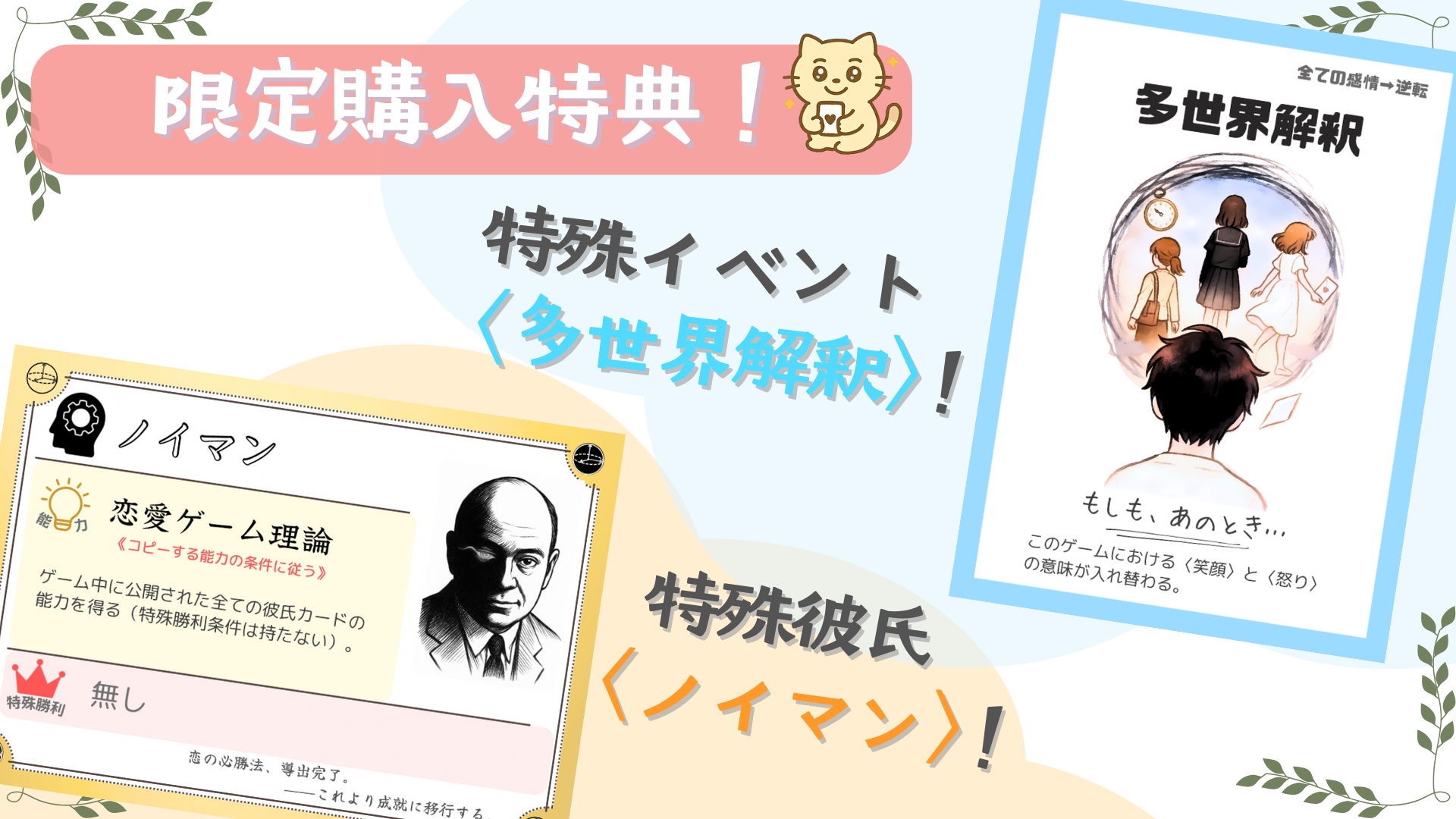 《シュレディンガーの猫系彼女》をゲームマーケット2025秋で購入いただいた皆様には、特殊イベントカード&特殊"彼氏"カードを1枚ずつプレゼントさせていただきます!🎁