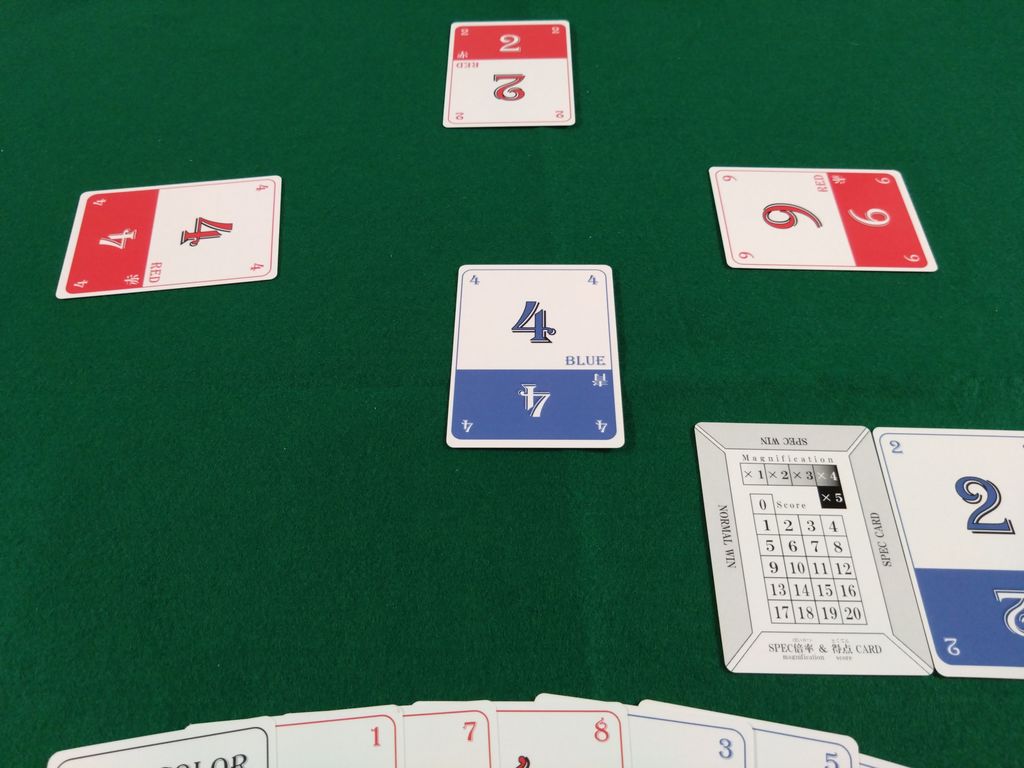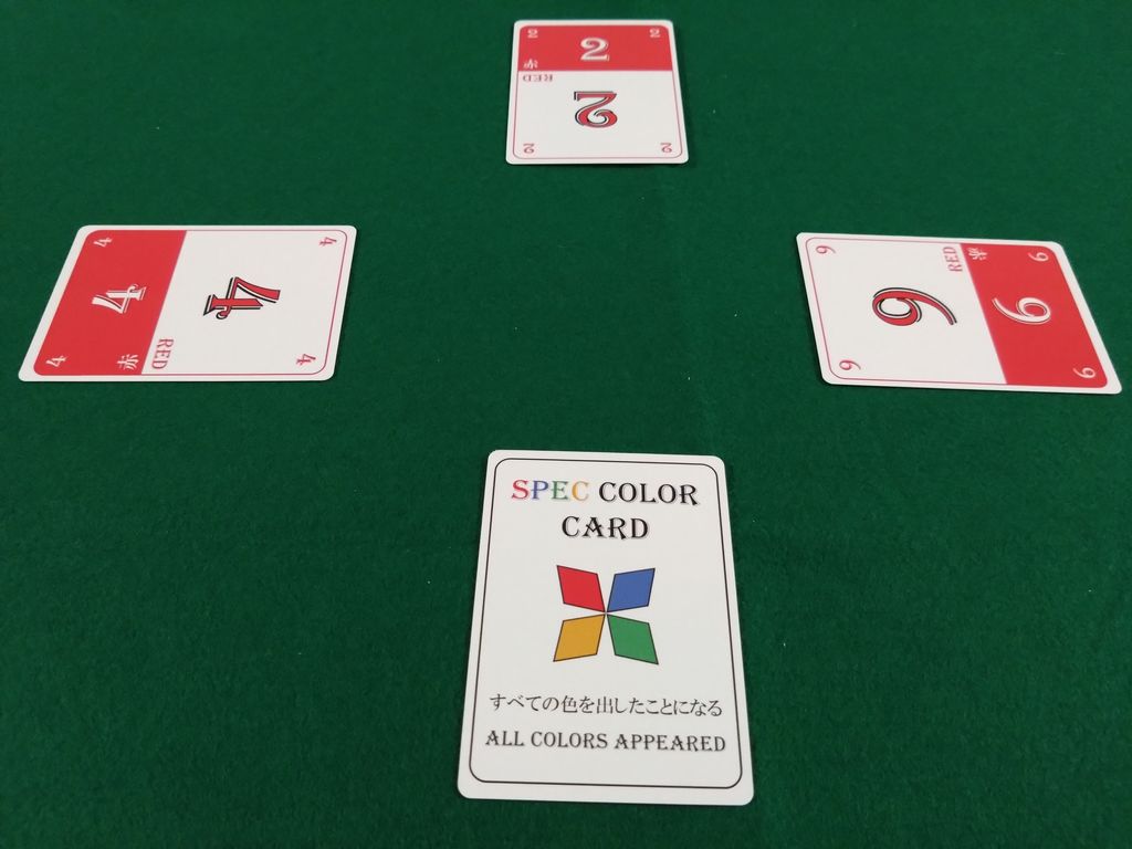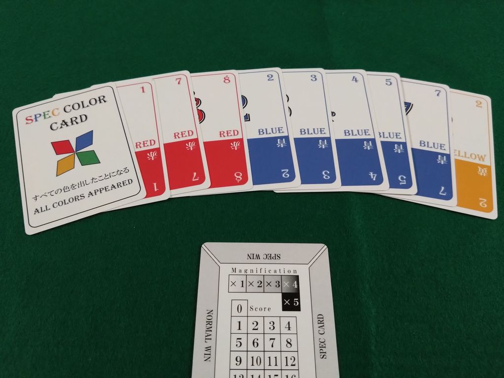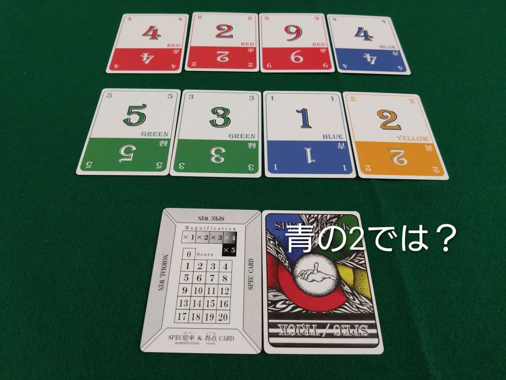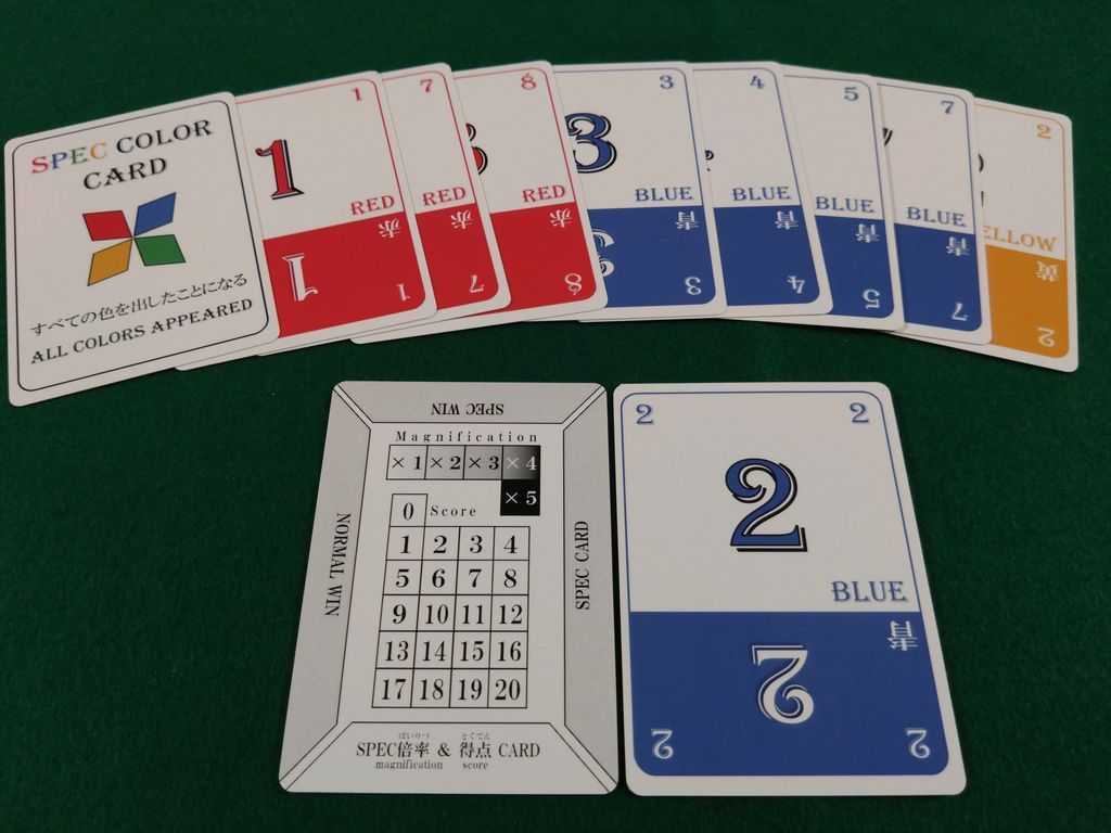別の手番でも赤の4から始まり、「2」があるので、最後に自分が「青」を出せば「SPEC」です