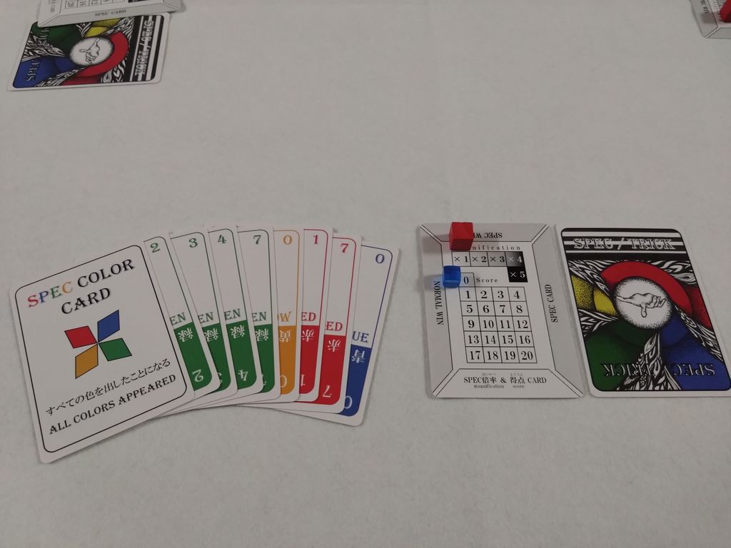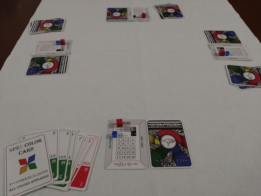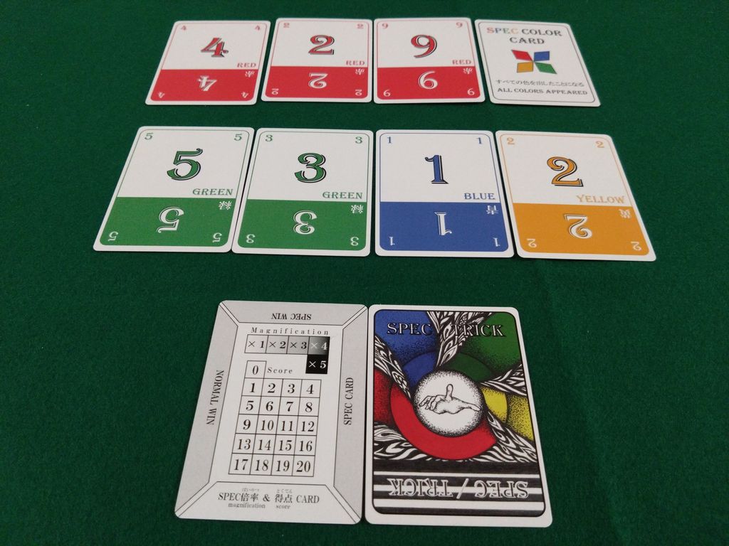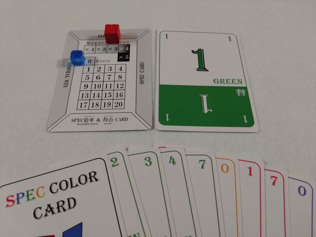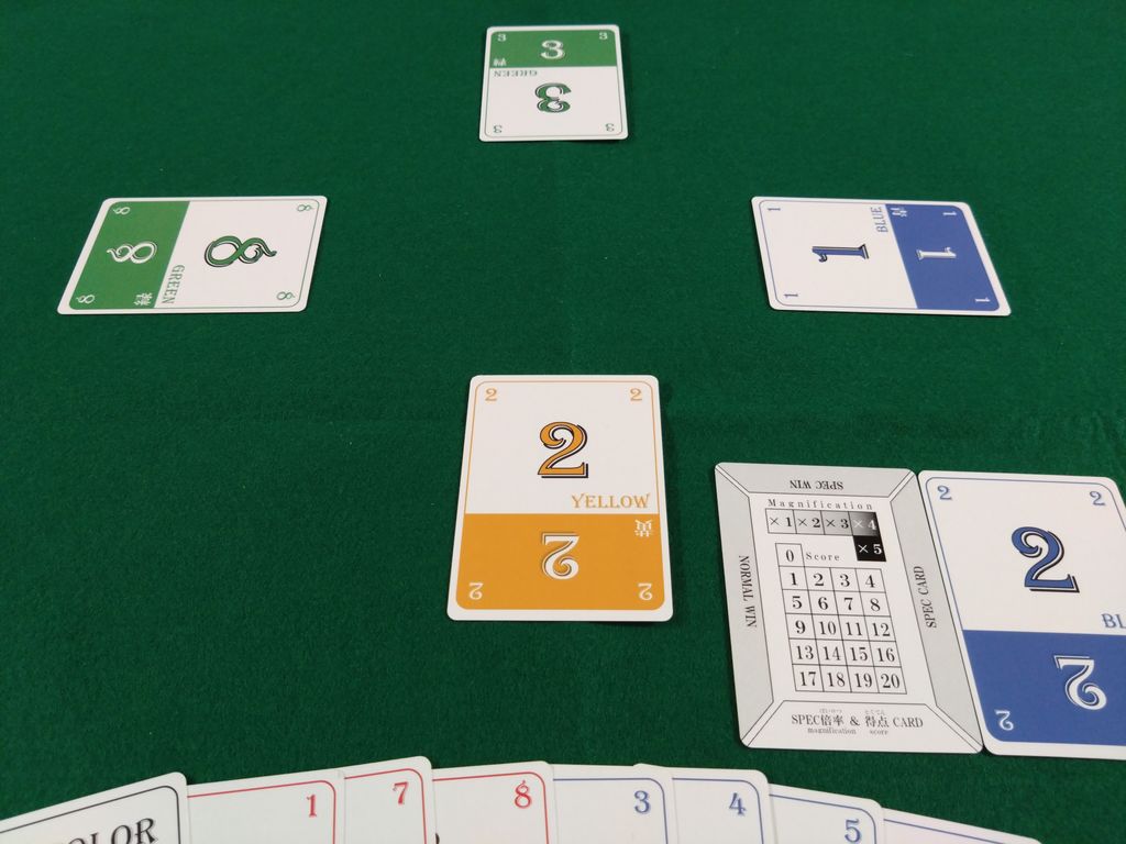 例えば、自分が最後手番(緑の8がスタートプレイヤーで時計回り)の場合、黄色の「2」を出せば「青」と「2」が場に揃ったことになり勝利です。ポーズを決めて(任意)カッコよく「SPEC」と宣言しましょう