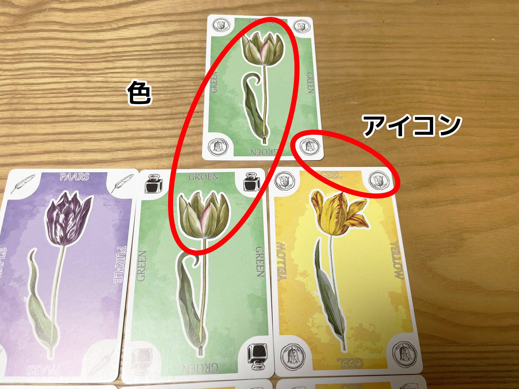 2.カードの取り方:「色」もしくは「アイコン」が一致するものを獲得
