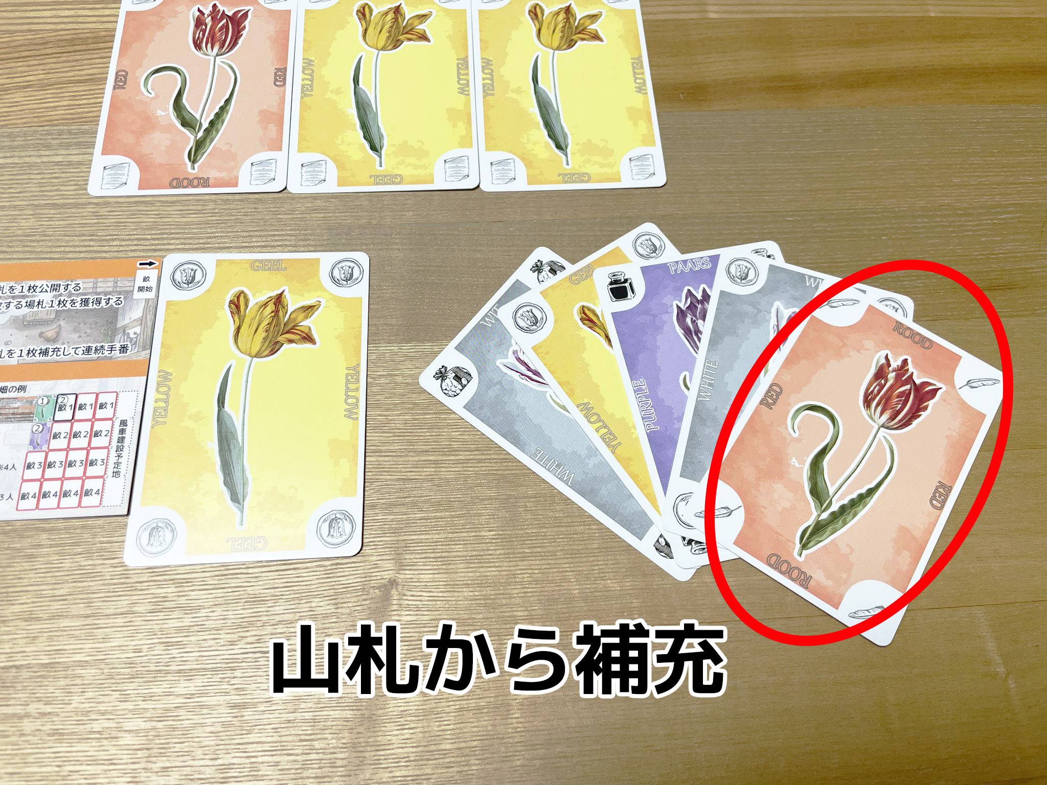 5.ドロー:手札を補充して手番終了。これをゲーム終了まで繰り返します。