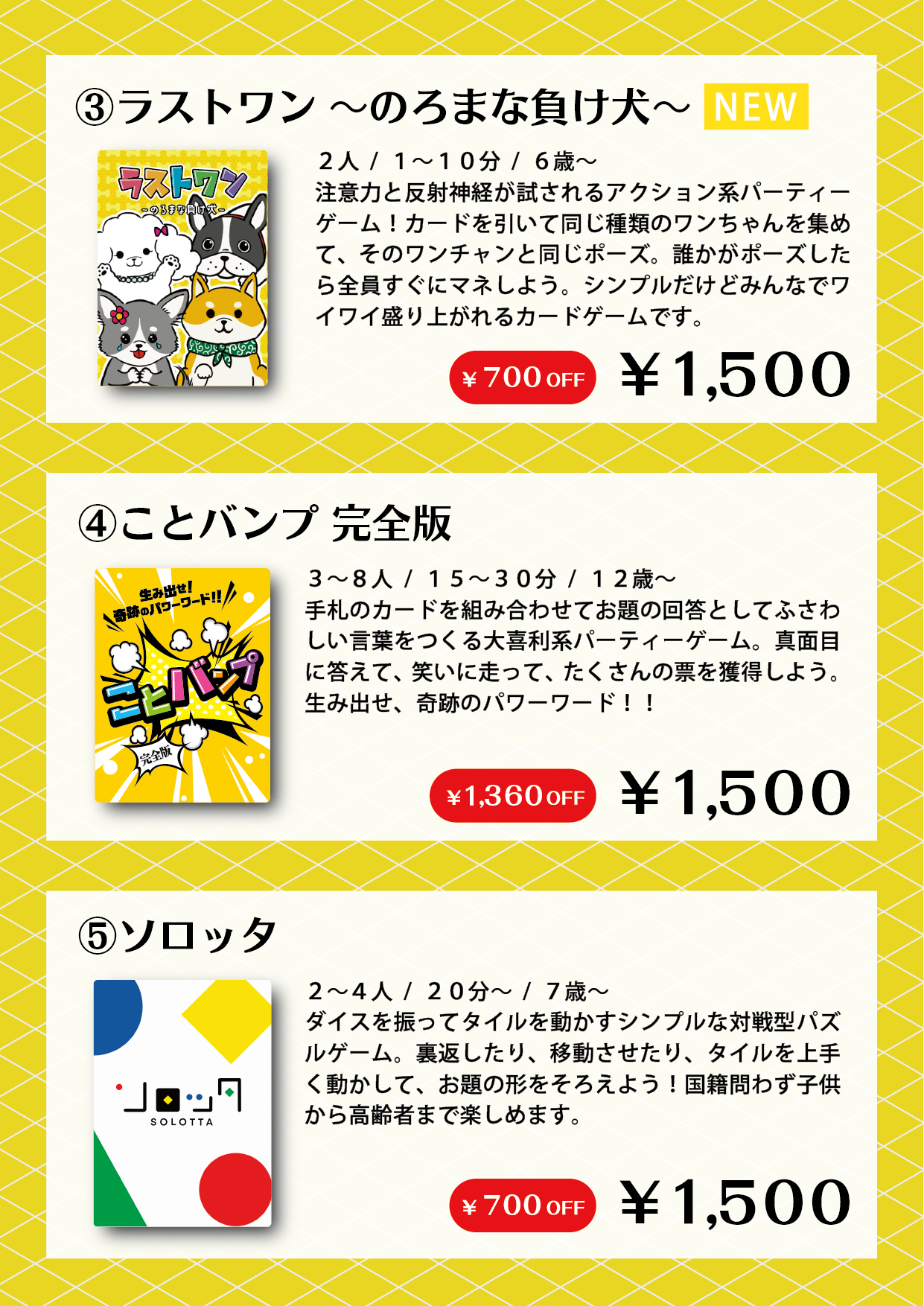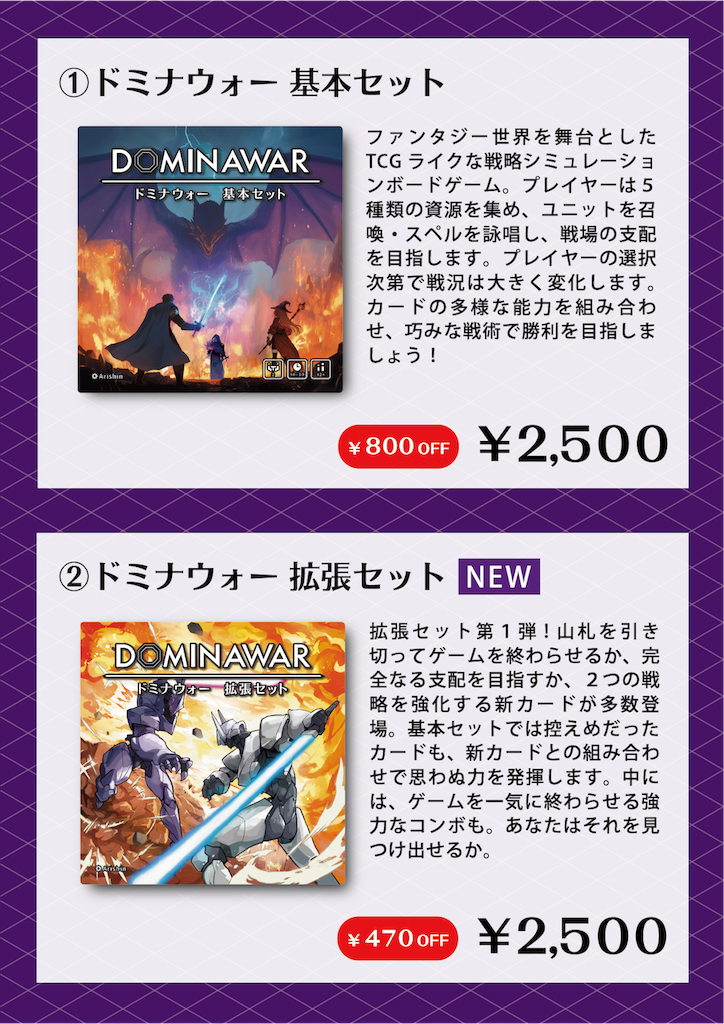 ゲムマ2025秋11/22(土)、R22ブースにて『ドミナウォー 基本セット』『ドミナウォー 拡張セット』『ラストワン〜のろまな負け犬〜』『ことバンプ 完全版』『ソロッタ』を販売します。 予約フォームは https://forms.gle/QpfyXEogXxtf5LBo9