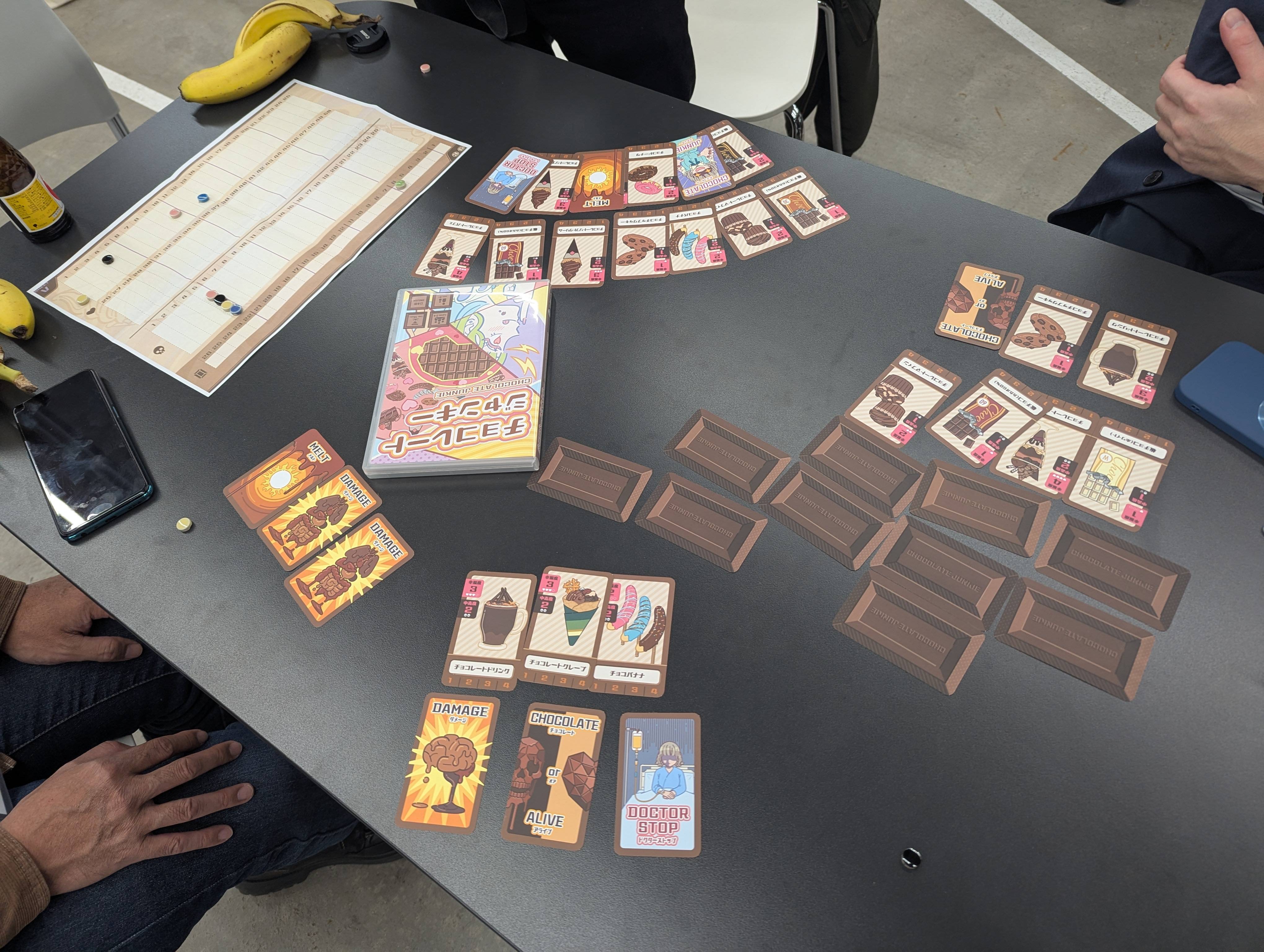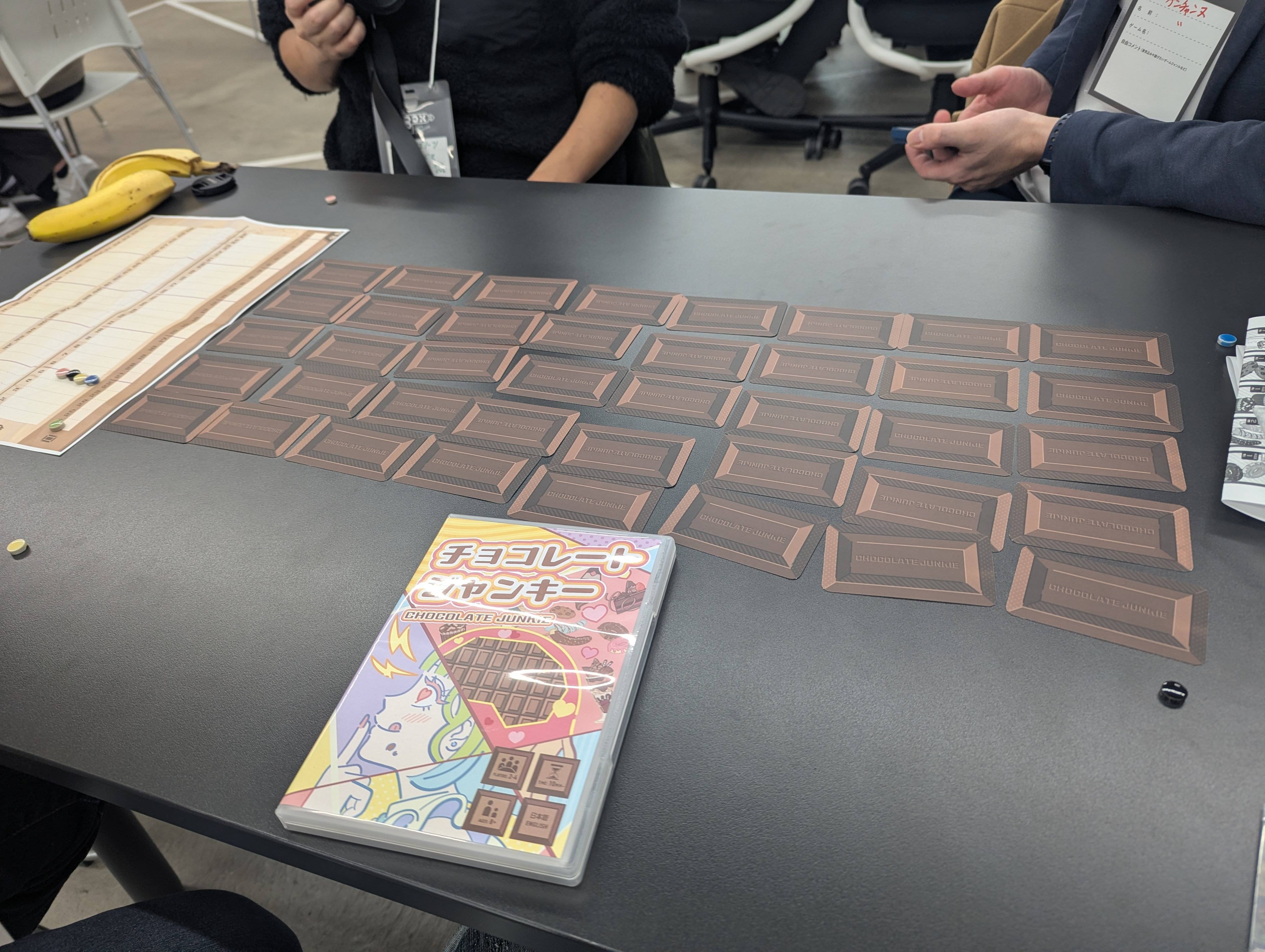 たまたま座ったテーブルの4人中3人がDVDトールケースサイズのゲームを作っていたので、記念に撮りました。