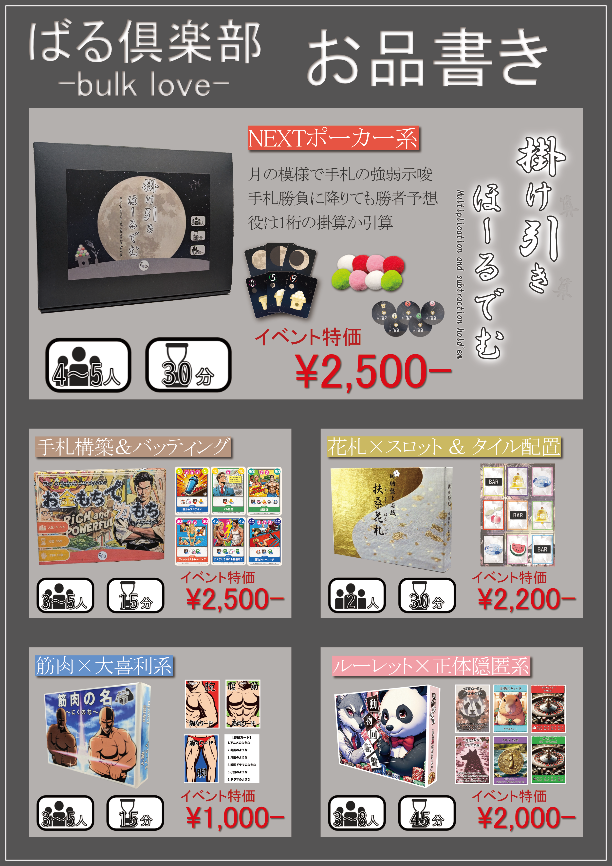 筋肉とボードゲームを愛する「ばる倶楽部」です! <ボードゲームは脳の筋トレ> ➡第1弾「筋肉の名~にくのな~」 大喜利系筋肉セットコレクション ➡第2弾「扶桑花札~ふそうはなふだ~」 スロットと花札を合わせた2人用対戦ボードゲーム ➡第3弾「コレクトリテ~ボディビルver~」 筋肉×セットコレクション×トリックテイキング ➡第4弾「動物回転盤~アニマルーレット~」 1つで2つの遊び方 正体隠匿&推理予測の得点勝負 ➡第5弾「お金もちで力もち」 リッチでマッスルな人物を目指す簡単ルールのバッティングゲーム ➡第6弾「掛け引きほーるでむ」 うさぎたちがお月見ポーカーでお団子の奪い合い